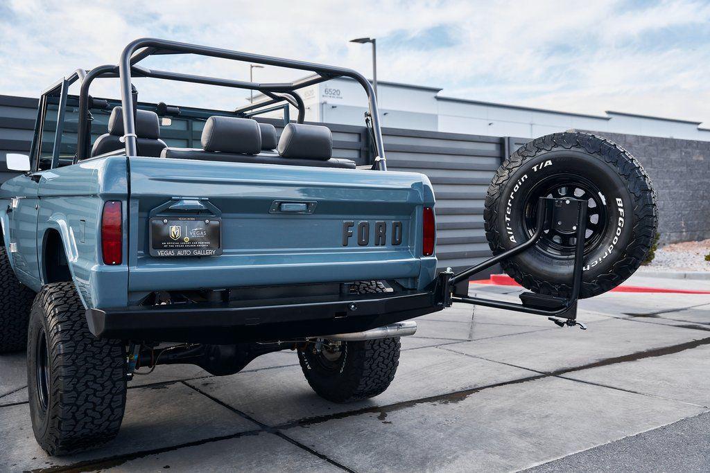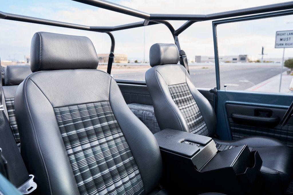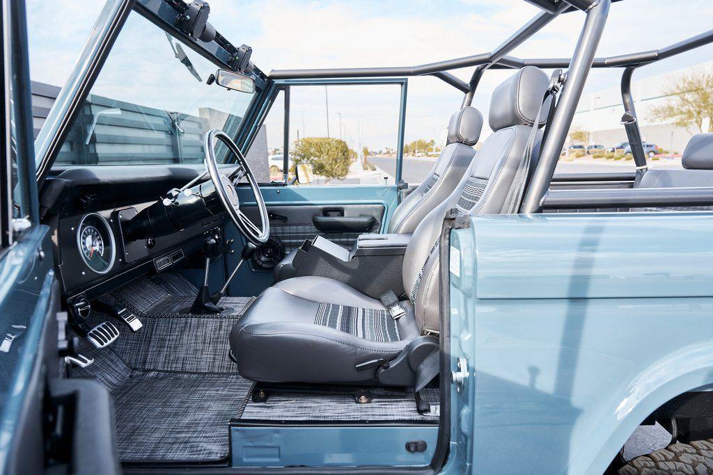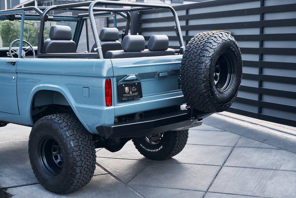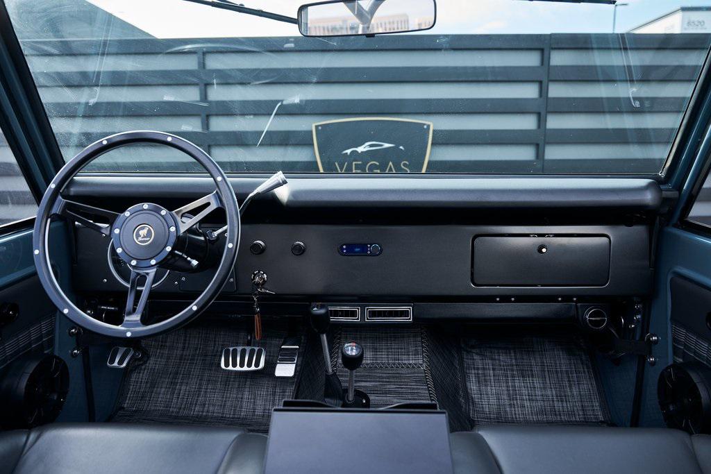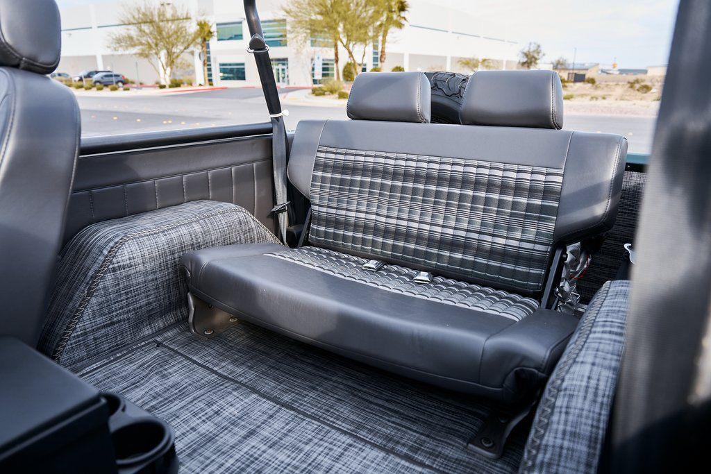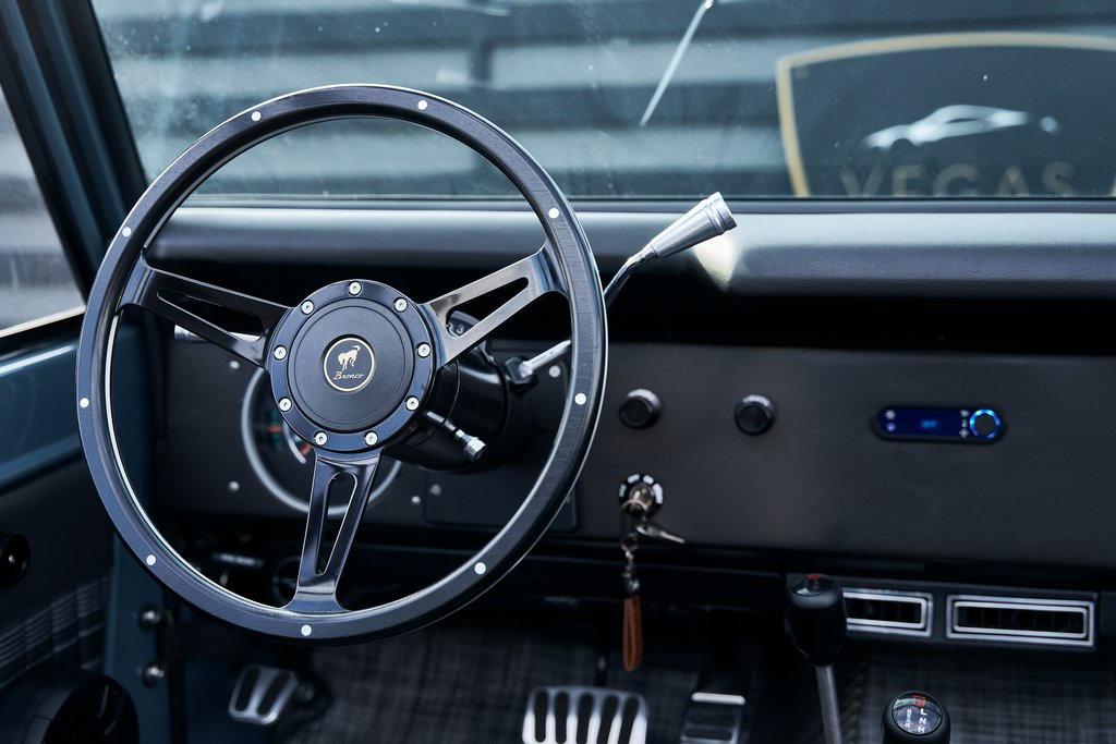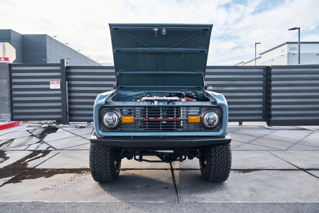 This 1977 Ford Bronco was refurbished and modified. Work consisted of repainting the truck in Ford (Area 51) Paint, applying rhino liner coating to the underbody, reupholstering the interior in charcoal gray leather with patterned cloth, and installing a 5.0-liter Coyote V8 linked with a six-speed 6R80 automatic transmission and a twin-stick dual-range transfer case. The interior is equipped with automatic climate control, an Icon center console, a Pioneer touchscreen infotainment system, a custom audio system, Dakota Digital instrumentation, and patterned floor coverings. Additional equipment includes LED headlights, charcoal gray-finished exterior trim and bumpers, a suspension lift kit, Bilstein shock absorbers, a hydroboost brake system, four-wheel disc brakes, manually locking front hubs, and black 15 steel wheels. The truck was repainted in its current shade of Area 51 during the refurbishment and details include a roll cage, LED headlights, tinted windows, stainless-steel door hinges, a receiver hitch, and a charcoal gray-finished grille, bumpers, exterior trim, and mirrors.Black 15 steel wheels are mounted with 33×12.50 BFGoodrich K02 All-Terrain tires. A suspension lift has been fitted along with power-assisted steering, a steering stabilizer, Bilstein shock absorbers, and manually locking front hubs. Braking is handled by four-wheel discs with a hydroboost system and aluminum master cylinder.The cabin houses bolstered front bucket seats and a rear bench trimmed in charcoal gray leather with patterned cloth inserts that extend to the dashboard pad, door panels, and rear trim. An automatic climate control system has been fitted, and a twin-stick transfer-case shifter, an Icon center console, a Pioneer touchscreen infotainment system, a custom audio system, aluminum pedals, and patterned floor coverings are also equipped.The three-spoke steering wheel frames a Dakota Digital RTX combination gauge with a 120-mph speedometer, a tachometer, and auxiliary readouts. Total mileage is unknown.A 5.0-liter, third generation, Coyote V8 with a custom exhaust system was fitted during the build at which time the wiring harness, battery, radiator, fans, belts, hoses, and fuel lines were replaced.Power is sent to the rear or all four wheels through a 6R80 six-speed automatic transmission and a dual-range transfer case as well as a Dana 44 front axle and a 9 rear end. A transmission cooler was also installed.This is an immaculate build and won't last long!