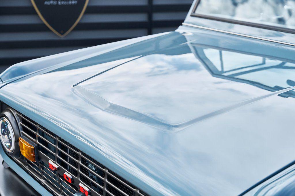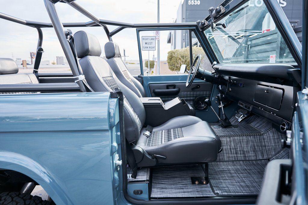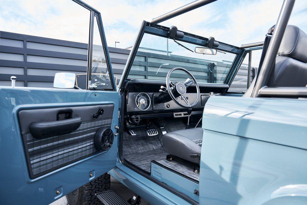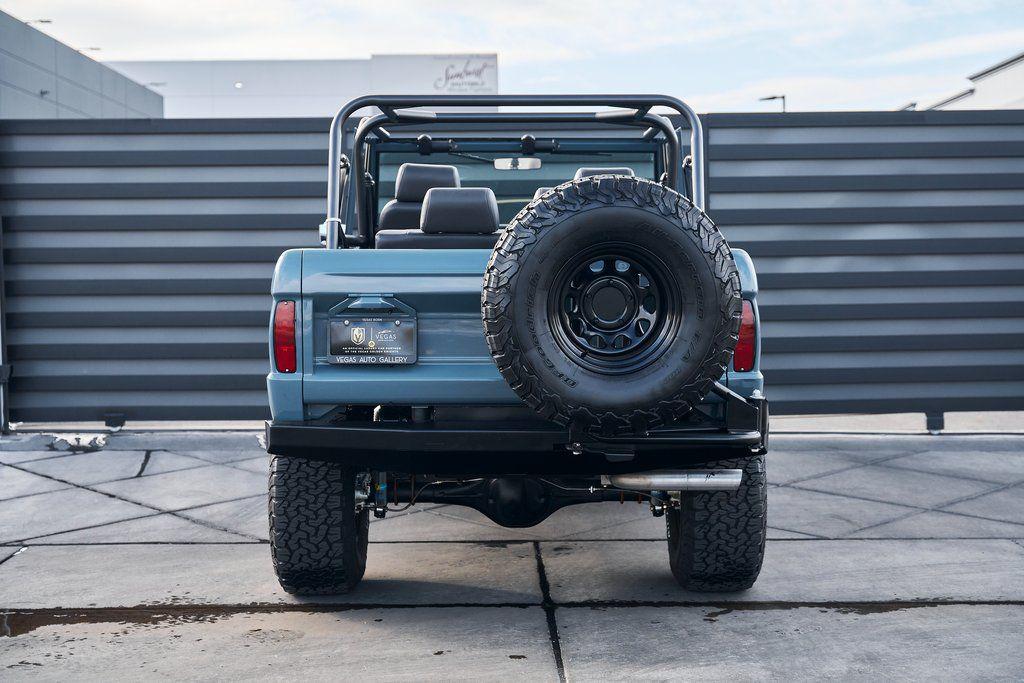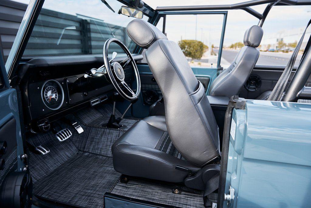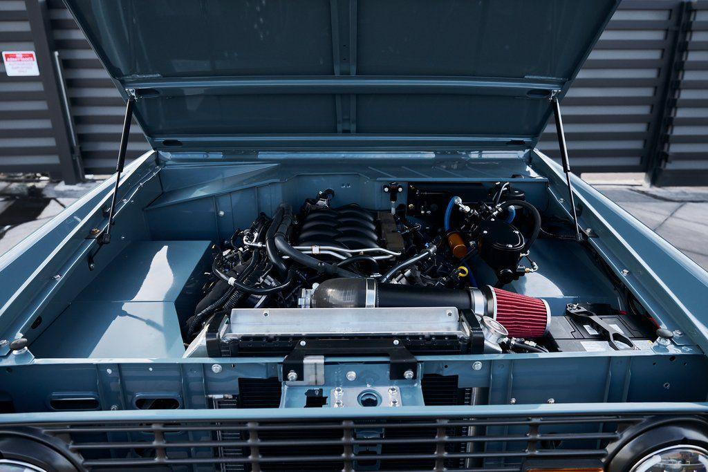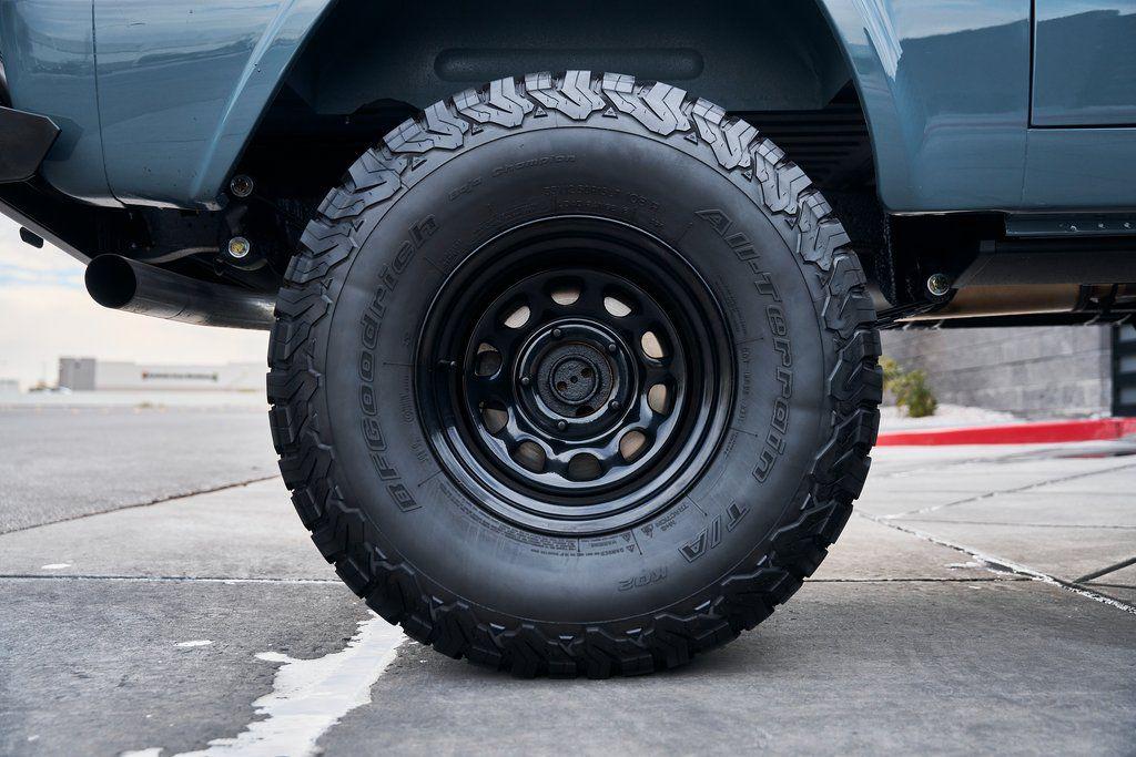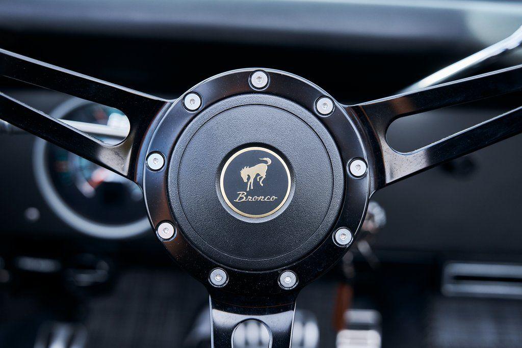 This 1977 Ford Bronco was refurbished and modified. Work consisted of repainting the truck in Ford (Area 51) Paint, applying rhino liner coating to the underbody, reupholstering the interior in charcoal gray leather with patterned cloth, and installing a 5.0-liter Coyote V8 linked with a six-speed 6R80 automatic transmission and a twin-stick dual-range transfer case. The interior is equipped with automatic climate control, an Icon center console, a Pioneer touchscreen infotainment system, a custom audio system, Dakota Digital instrumentation, and patterned floor coverings. Additional equipment includes LED headlights, charcoal gray-finished exterior trim and bumpers, a suspension lift kit, Bilstein shock absorbers, a hydroboost brake system, four-wheel disc brakes, manually locking front hubs, and black 15 steel wheels. The truck was repainted in its current shade of Area 51 during the refurbishment and details include a roll cage, LED headlights, tinted windows, stainless-steel door hinges, a receiver hitch, and a charcoal gray-finished grille, bumpers, exterior trim, and mirrors.Black 15 steel wheels are mounted with 33×12.50 BFGoodrich K02 All-Terrain tires. A suspension lift has been fitted along with power-assisted steering, a steering stabilizer, Bilstein shock absorbers, and manually locking front hubs. Braking is handled by four-wheel discs with a hydroboost system and aluminum master cylinder.The cabin houses bolstered front bucket seats and a rear bench trimmed in charcoal gray leather with patterned cloth inserts that extend to the dashboard pad, door panels, and rear trim. An automatic climate control system has been fitted, and a twin-stick transfer-case shifter, an Icon center console, a Pioneer touchscreen infotainment system, a custom audio system, aluminum pedals, and patterned floor coverings are also equipped.The three-spoke steering wheel frames a Dakota Digital RTX combination gauge with a 120-mph speedometer, a tachometer, and auxiliary readouts. Total mileage is unknown.A 5.0-liter, third generation, Coyote V8 with a custom exhaust system was fitted during the build at which time the wiring harness, battery, radiator, fans, belts, hoses, and fuel lines were replaced.Power is sent to the rear or all four wheels through a 6R80 six-speed automatic transmission and a dual-range transfer case as well as a Dana 44 front axle and a 9 rear end. A transmission cooler was also installed.This is an immaculate build and won't last long!