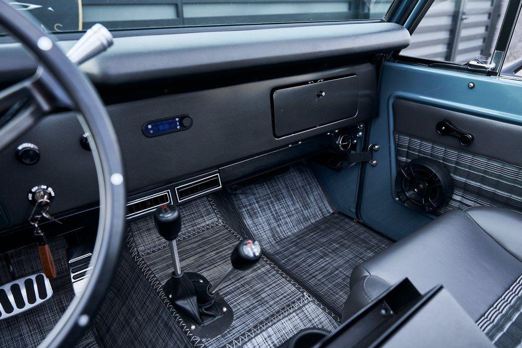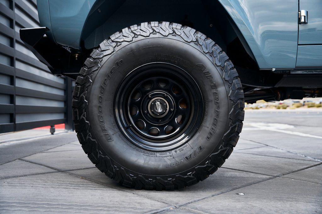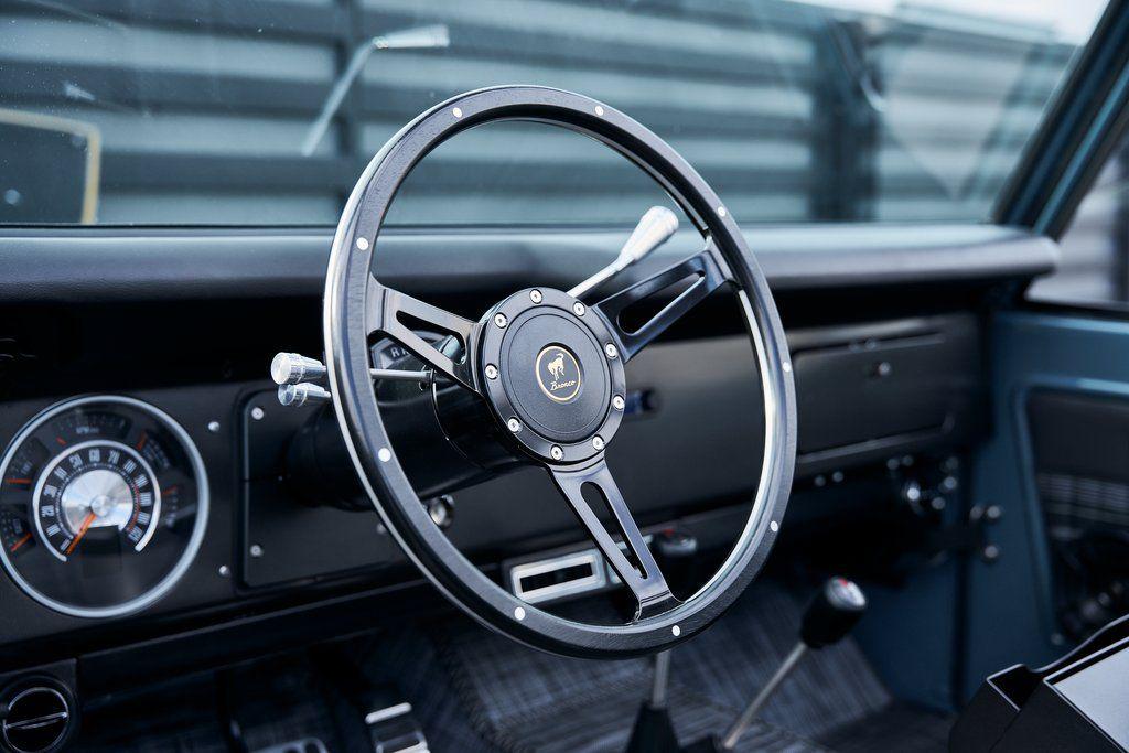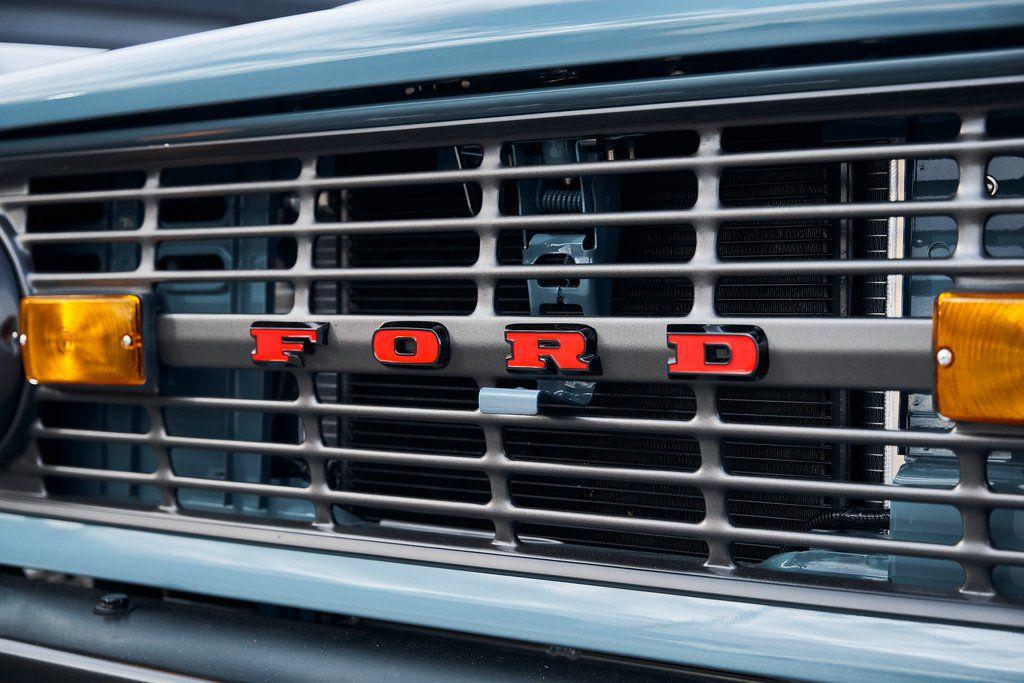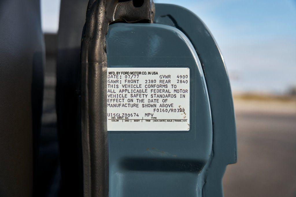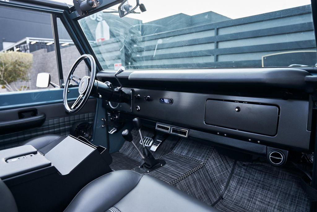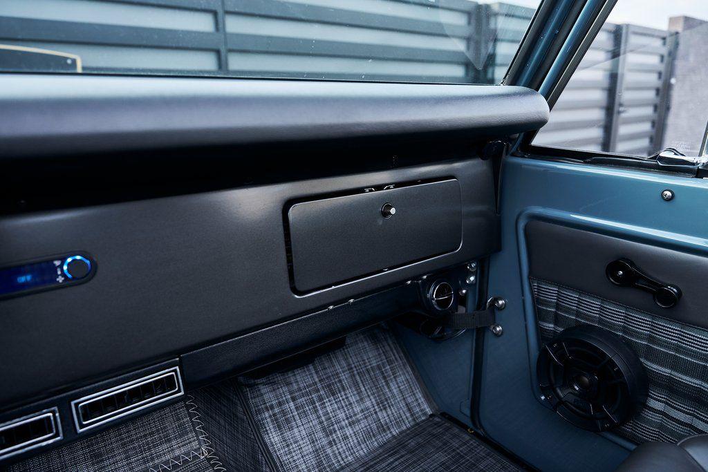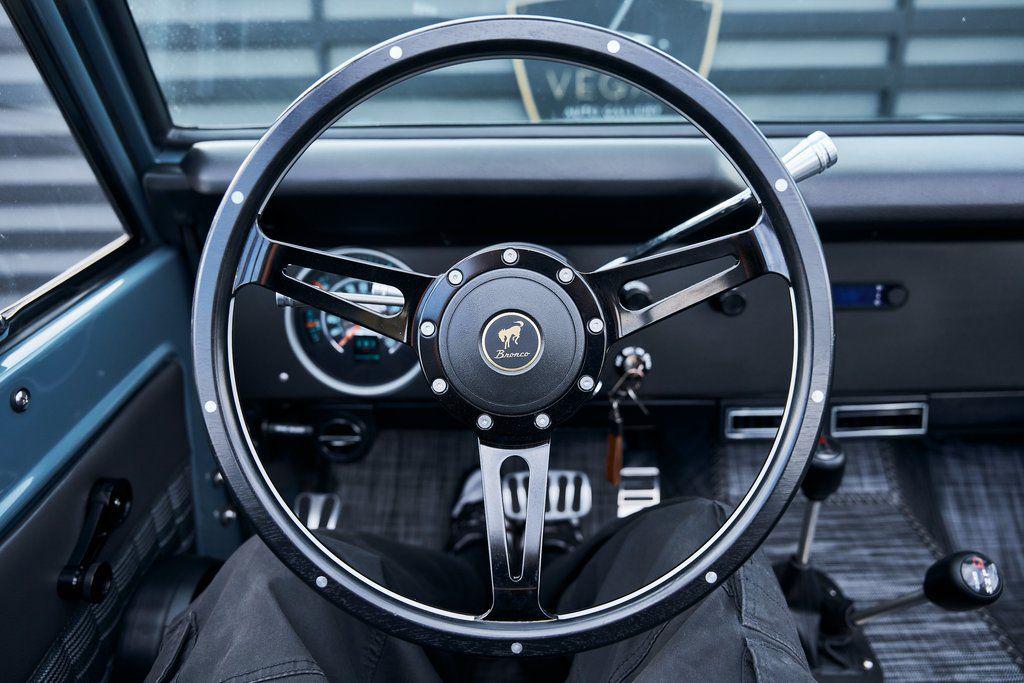 This 1977 Ford Bronco was refurbished and modified. Work consisted of repainting the truck in Ford (Area 51) Paint, applying rhino liner coating to the underbody, reupholstering the interior in charcoal gray leather with patterned cloth, and installing a 5.0-liter Coyote V8 linked with a six-speed 6R80 automatic transmission and a twin-stick dual-range transfer case. The interior is equipped with automatic climate control, an Icon center console, a Pioneer touchscreen infotainment system, a custom audio system, Dakota Digital instrumentation, and patterned floor coverings. Additional equipment includes LED headlights, charcoal gray-finished exterior trim and bumpers, a suspension lift kit, Bilstein shock absorbers, a hydroboost brake system, four-wheel disc brakes, manually locking front hubs, and black 15 steel wheels. The truck was repainted in its current shade of Area 51 during the refurbishment and details include a roll cage, LED headlights, tinted windows, stainless-steel door hinges, a receiver hitch, and a charcoal gray-finished grille, bumpers, exterior trim, and mirrors.Black 15 steel wheels are mounted with 33×12.50 BFGoodrich K02 All-Terrain tires. A suspension lift has been fitted along with power-assisted steering, a steering stabilizer, Bilstein shock absorbers, and manually locking front hubs. Braking is handled by four-wheel discs with a hydroboost system and aluminum master cylinder.The cabin houses bolstered front bucket seats and a rear bench trimmed in charcoal gray leather with patterned cloth inserts that extend to the dashboard pad, door panels, and rear trim. An automatic climate control system has been fitted, and a twin-stick transfer-case shifter, an Icon center console, a Pioneer touchscreen infotainment system, a custom audio system, aluminum pedals, and patterned floor coverings are also equipped.The three-spoke steering wheel frames a Dakota Digital RTX combination gauge with a 120-mph speedometer, a tachometer, and auxiliary readouts. Total mileage is unknown.A 5.0-liter, third generation, Coyote V8 with a custom exhaust system was fitted during the build at which time the wiring harness, battery, radiator, fans, belts, hoses, and fuel lines were replaced.Power is sent to the rear or all four wheels through a 6R80 six-speed automatic transmission and a dual-range transfer case as well as a Dana 44 front axle and a 9 rear end. A transmission cooler was also installed.This is an immaculate build and won't last long!