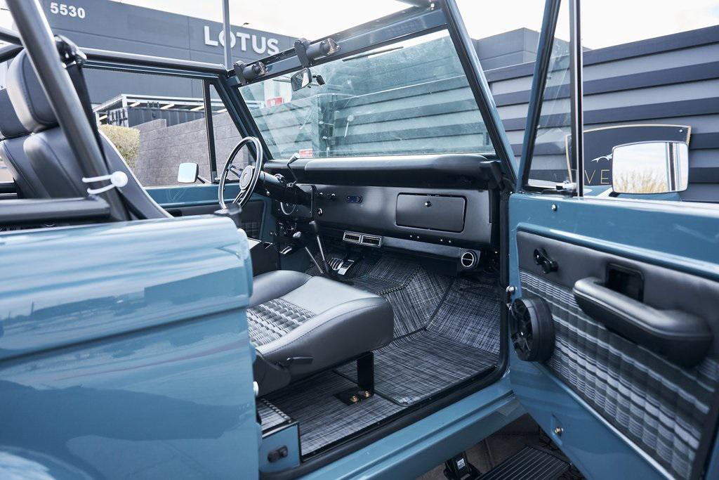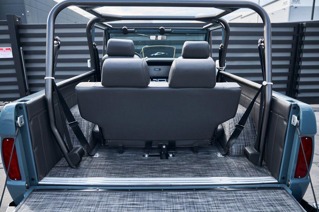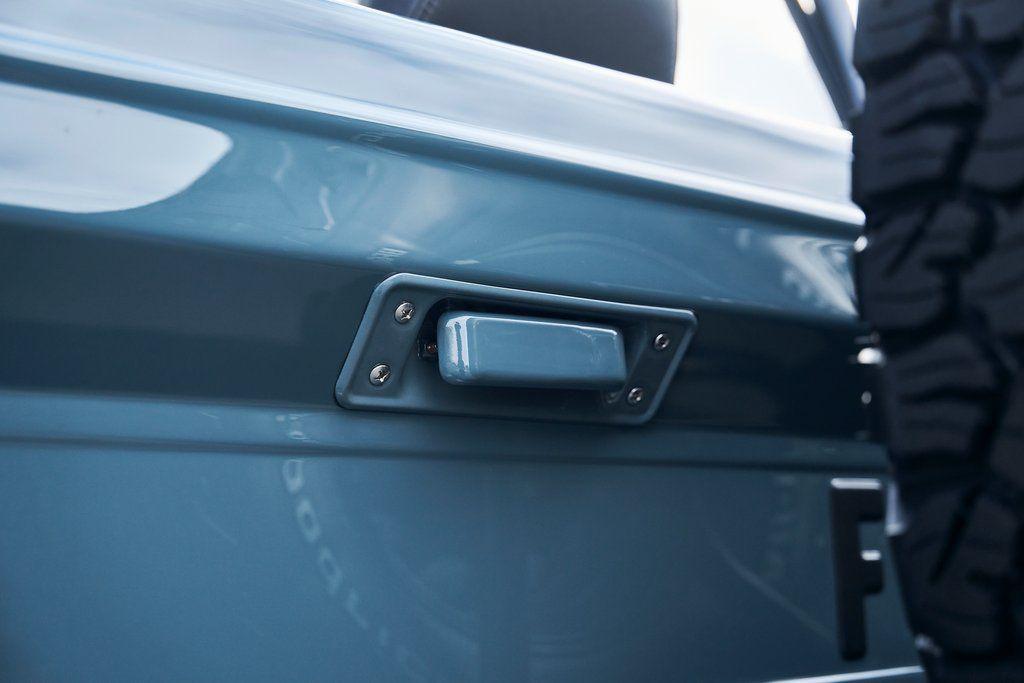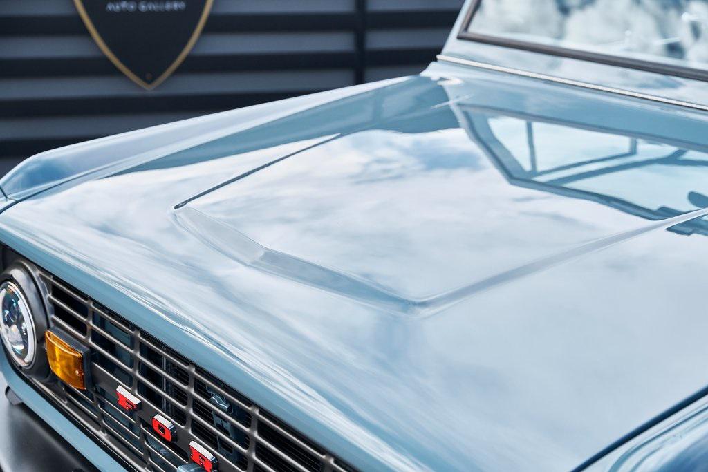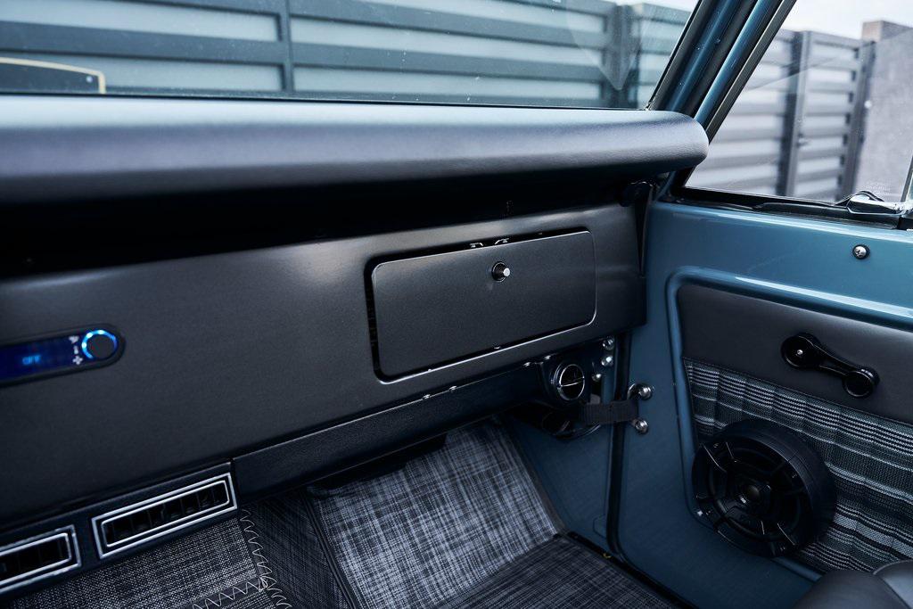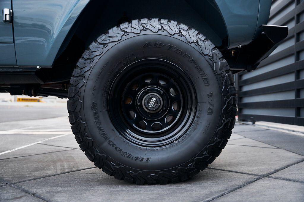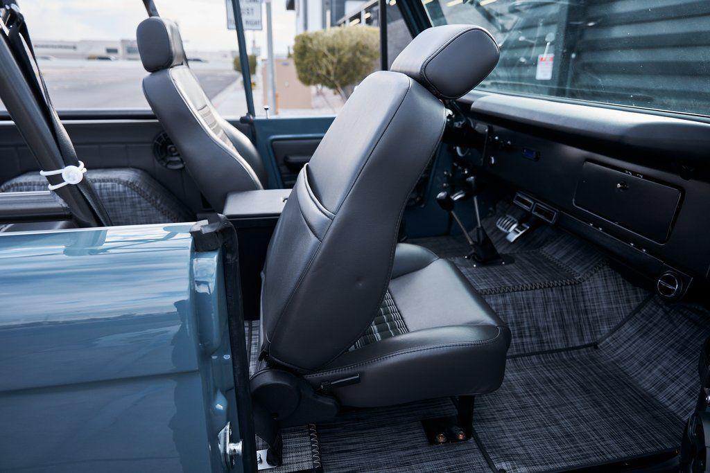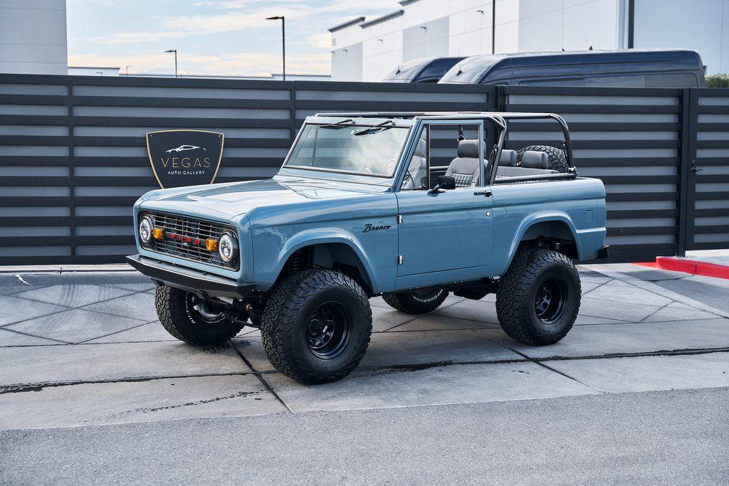 This 1977 Ford Bronco was refurbished and modified. Work consisted of repainting the truck in Ford (Area 51) Paint, applying rhino liner coating to the underbody, reupholstering the interior in charcoal gray leather with patterned cloth, and installing a 5.0-liter Coyote V8 linked with a six-speed 6R80 automatic transmission and a twin-stick dual-range transfer case. The interior is equipped with automatic climate control, an Icon center console, a Pioneer touchscreen infotainment system, a custom audio system, Dakota Digital instrumentation, and patterned floor coverings. Additional equipment includes LED headlights, charcoal gray-finished exterior trim and bumpers, a suspension lift kit, Bilstein shock absorbers, a hydroboost brake system, four-wheel disc brakes, manually locking front hubs, and black 15 steel wheels. The truck was repainted in its current shade of Area 51 during the refurbishment and details include a roll cage, LED headlights, tinted windows, stainless-steel door hinges, a receiver hitch, and a charcoal gray-finished grille, bumpers, exterior trim, and mirrors.Black 15 steel wheels are mounted with 33×12.50 BFGoodrich K02 All-Terrain tires. A suspension lift has been fitted along with power-assisted steering, a steering stabilizer, Bilstein shock absorbers, and manually locking front hubs. Braking is handled by four-wheel discs with a hydroboost system and aluminum master cylinder.The cabin houses bolstered front bucket seats and a rear bench trimmed in charcoal gray leather with patterned cloth inserts that extend to the dashboard pad, door panels, and rear trim. An automatic climate control system has been fitted, and a twin-stick transfer-case shifter, an Icon center console, a Pioneer touchscreen infotainment system, a custom audio system, aluminum pedals, and patterned floor coverings are also equipped.The three-spoke steering wheel frames a Dakota Digital RTX combination gauge with a 120-mph speedometer, a tachometer, and auxiliary readouts. Total mileage is unknown.A 5.0-liter, third generation, Coyote V8 with a custom exhaust system was fitted during the build at which time the wiring harness, battery, radiator, fans, belts, hoses, and fuel lines were replaced.Power is sent to the rear or all four wheels through a 6R80 six-speed automatic transmission and a dual-range transfer case as well as a Dana 44 front axle and a 9 rear end. A transmission cooler was also installed.This is an immaculate build and won't last long!