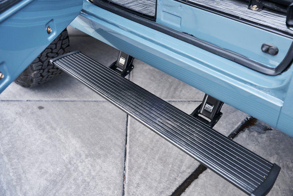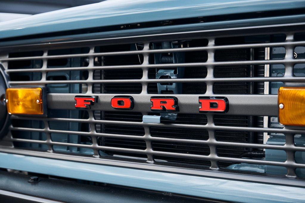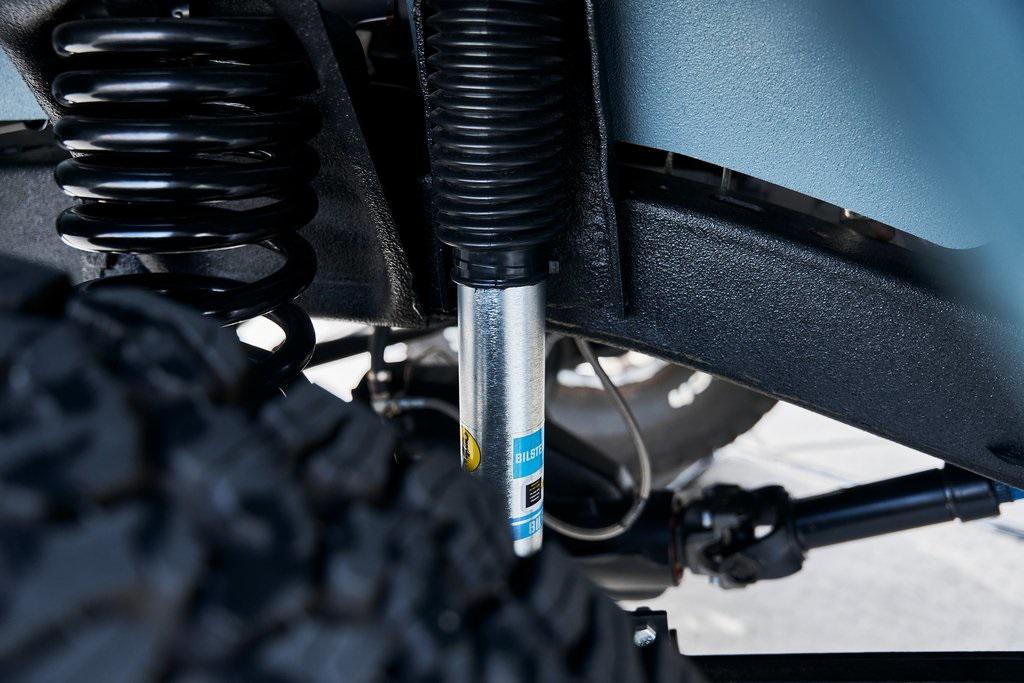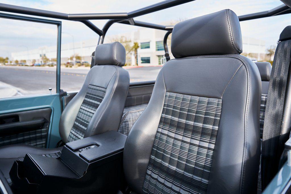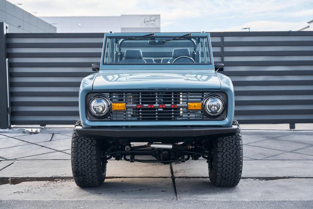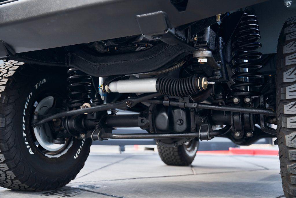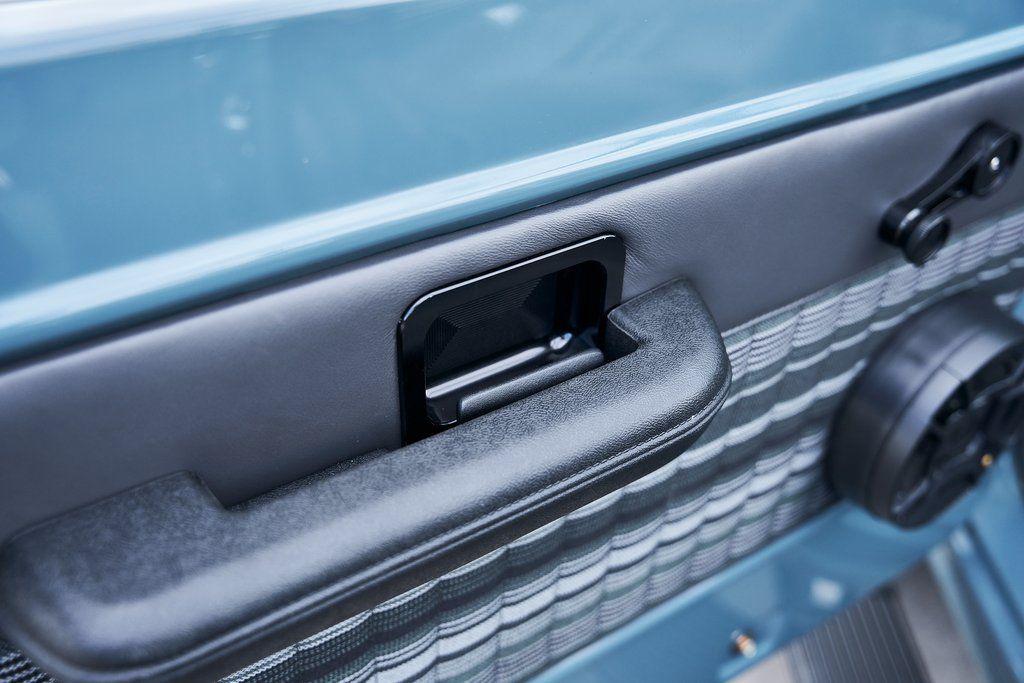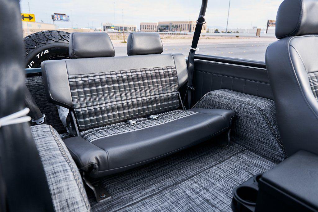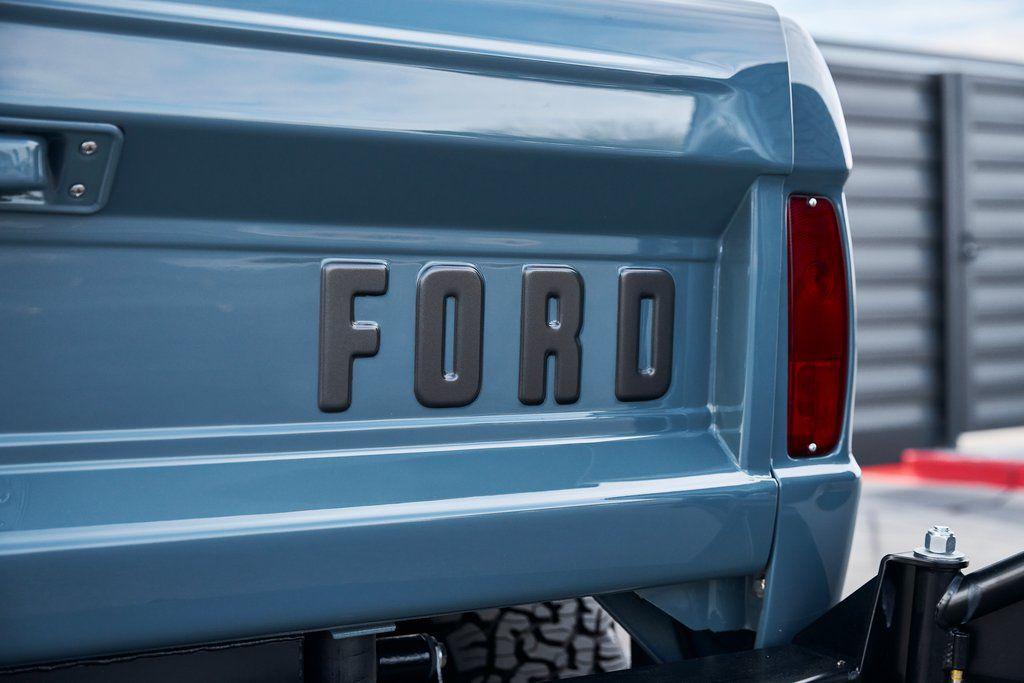 This 1977 Ford Bronco was refurbished and modified. Work consisted of repainting the truck in Ford (Area 51) Paint, applying rhino liner coating to the underbody, reupholstering the interior in charcoal gray leather with patterned cloth, and installing a 5.0-liter Coyote V8 linked with a six-speed 6R80 automatic transmission and a twin-stick dual-range transfer case. The interior is equipped with automatic climate control, an Icon center console, a Pioneer touchscreen infotainment system, a custom audio system, Dakota Digital instrumentation, and patterned floor coverings. Additional equipment includes LED headlights, charcoal gray-finished exterior trim and bumpers, a suspension lift kit, Bilstein shock absorbers, a hydroboost brake system, four-wheel disc brakes, manually locking front hubs, and black 15 steel wheels. The truck was repainted in its current shade of Area 51 during the refurbishment and details include a roll cage, LED headlights, tinted windows, stainless-steel door hinges, a receiver hitch, and a charcoal gray-finished grille, bumpers, exterior trim, and mirrors.Black 15 steel wheels are mounted with 33×12.50 BFGoodrich K02 All-Terrain tires. A suspension lift has been fitted along with power-assisted steering, a steering stabilizer, Bilstein shock absorbers, and manually locking front hubs. Braking is handled by four-wheel discs with a hydroboost system and aluminum master cylinder.The cabin houses bolstered front bucket seats and a rear bench trimmed in charcoal gray leather with patterned cloth inserts that extend to the dashboard pad, door panels, and rear trim. An automatic climate control system has been fitted, and a twin-stick transfer-case shifter, an Icon center console, a Pioneer touchscreen infotainment system, a custom audio system, aluminum pedals, and patterned floor coverings are also equipped.The three-spoke steering wheel frames a Dakota Digital RTX combination gauge with a 120-mph speedometer, a tachometer, and auxiliary readouts. Total mileage is unknown.A 5.0-liter, third generation, Coyote V8 with a custom exhaust system was fitted during the build at which time the wiring harness, battery, radiator, fans, belts, hoses, and fuel lines were replaced.Power is sent to the rear or all four wheels through a 6R80 six-speed automatic transmission and a dual-range transfer case as well as a Dana 44 front axle and a 9 rear end. A transmission cooler was also installed.This is an immaculate build and won't last long!