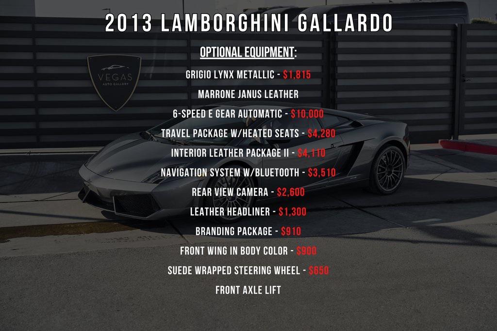 2013 LAMBORGHINI GALLARDODIAMOND STITCHING, LIFTING SYSTEM, POWER HEATED SEATS, TRAVEL PACKAGE, AND MORE!OVERVIEWThe 2013 Lamborghini Gallardo captures everything that defined supercars in the '00s McBling era––striking design, exotic character, and a visceral driving experience. As one of the most iconic models of its era––and the first production Lamborghini to feature a V10––the Gallardo marked Lamborghini's evolution under the Volkswagen Group without losing a bit of its dramatic flair. Mounted behind the driver lies a naturally aspirated 5.2-liter V10 engine, producing 550 horsepower and 398 lb-ft of torque. Paired with Lamborghini's e.gear automated transmission, it delivers relentless power and an intoxicating exhaust note that builds to a howling crescendo at 8,000 rpm. The result is a 0-60 mph sprint in just 4.0 seconds and a top speed of 196 mph––figures that remain thrilling even by modern standards. The chassis is built around an aluminum space frame for lightness and rigidity. Its compact proportions, sport-tuned suspension, and variable torque split system make it both agile and confidence-inspiring. Visually, the Gallardo's Italian design is timeless––angular, aggressive, and purposeful. Sharp creases, a low, wedge-shaped stance make it instantly recognizable from every angle. Inside, Italian leather, machined aluminum switchgear, and a driver-centric layout create an environment that feels both exotic and refined. Heated power seats, a navigation system, and a rear-view parking camera add convenience that we have come to expect in the modern era. Representing a defining moment in Lamborghini history, the 2013 Gallardo is a car that bridged raw emotion with unmistakable style and V10 grunt. In an era of increasing complexity, the Gallardo's naturally aspirated soul continues to shine as one of the last truly analog exotics.OPTIONAL EQUIPMENTGrigio Lynx Metallic $1,815Marrone Janus Leather6-Speed E Gear Automatic $10,000Travel Package w/Heated Seats $4,280Interior Leather Package II $4,110Navigation System w/Bluetooth $3,510Rear View Camera $2,600Leather Headliner $1,300Branding Package $910Front Wing In Body Color $900Suede Wrapped Steering Wheel $650Front Axle LiftGENERALYear: 2013Mileage: 9,806VIN #: ZHWGU5BZ3DLA13609Engine Size: 5.2L V10Class: CoupeHorsepower: 550Color: Grigio Lynx MetallicInterior: Marrone JanusFuel: Premium Unleaded GasolineGear Box: 6-Speed E Gear AutomaticDoors: 2Seats: 2Cylinders: 10SAFETY EQUIPMENTOutboard Front Lap and Shoulder Safety BeltsAirbag Occupancy SensorDual Stage Driver and Passenger Front AirbagsTire Specific Low Tire Pressure WarningRear Backup Camera ABS & Driveline Traction Control Anti-Locking BrakesADDITIONAL INFORMATION1 Key IncludedBalance of Factory Warranty (if applicable)Extended Warranties Available