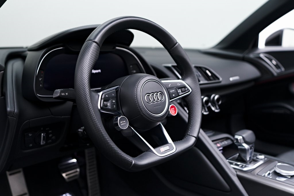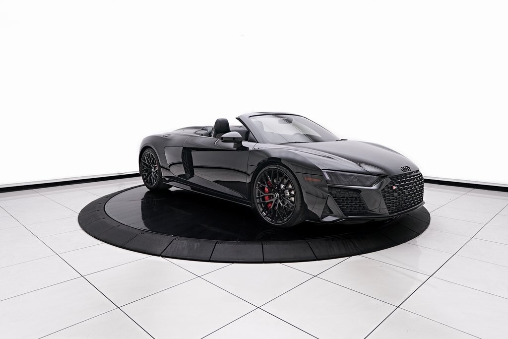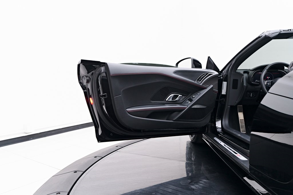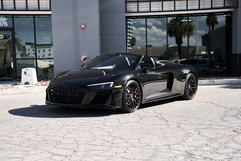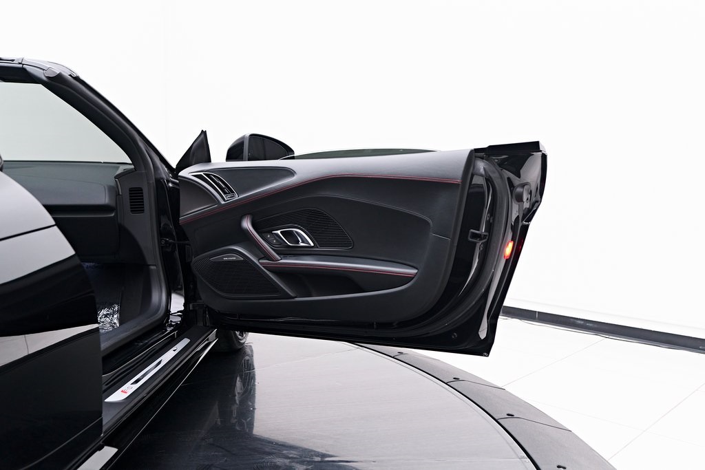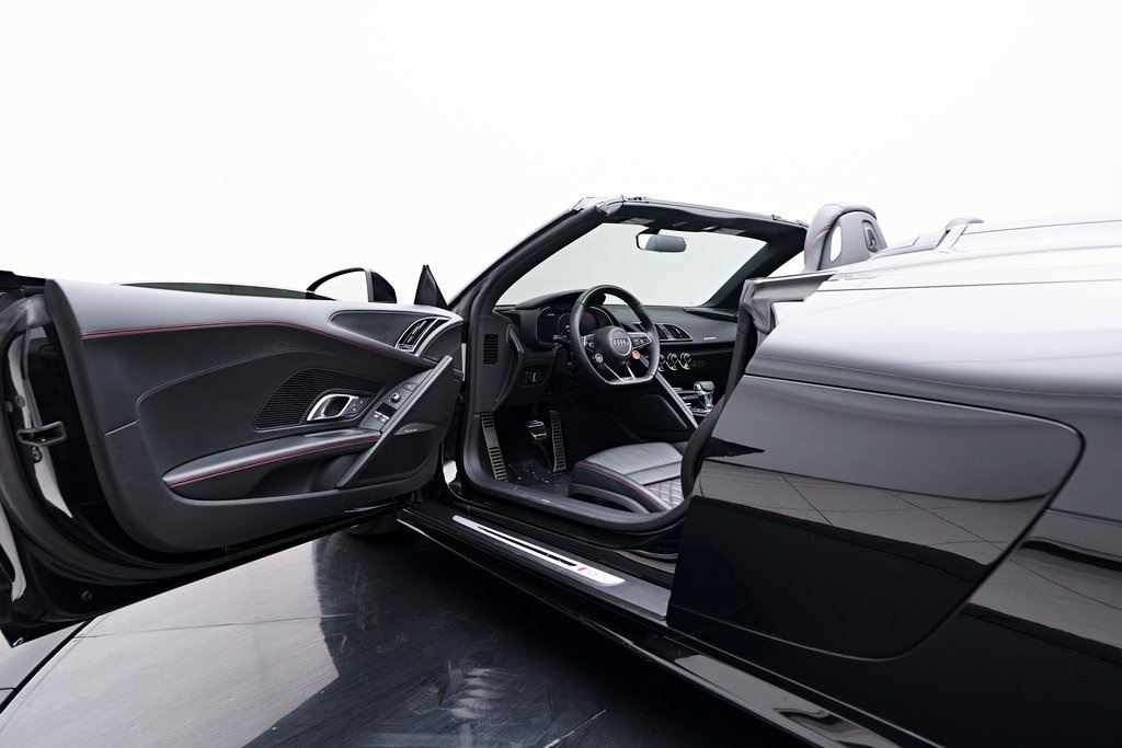 2020 AUDI R8 V10 SPYDER BANG & OLUFSEN SOUND SYSTEM, BLACK W/RED STITCHED INTERIOR, MYTHOS BLACK METALLIC, AND MORE!OVERVIEWThe 2020 Audi R8 V10 Spyder represents the pinnacle of open-air motoring from Audi's performance division, blending the everyday usability of a grand tourer with the thrill of a naturally aspirated supercar. Power comes from a 5.2-liter naturally aspirated V10, producing 562 horsepower and 406 lb-ft of torque, paired with a 7-speed dual-clutch transmission and Quattro all-wheel drive. The result is lightning-fast gear changes and a 0-60 mph sprint in just 3.5 seconds, accompanied by the distinct roar of the high-revving V10 as the roof folds away. The R8 features a design that is low, wide, and purposeful, with sharp creases, large air intakes, and Audi's signature Singleframe grille giving it an unmistakable presence. The chassis features a lightweight aluminum and carbon-fiber construction with Audi's dynamic steering system to deliver both sharp handling and long-distance comfort. Inside, the cabin strikes the ideal balance between luxury and focus. Fine Nappa leather sport seats, a 12.3-inch Audi Virtual Cockpit display, and Bang & Olufsen Audio emphasize performance while maintaining Audi's premium feel. The 2020 R8 V10 Spyder stands as one of the last naturally aspirated supercars available today, and its combination of open-top driving, Teutonic engineering, and everyday usability makes it a truly special car in its class.OPTIONAL EQUIPMENTMythos Black Metallic $595Black Fine Nappa Leather w/Red Stitching Diamond Stitch Leather Package $3,500Full Leather PackageDiamond Stitched Seats20"" 10-Spoke Y Design Wheels $1,500Red Brake Calipers $700Contrast Stitching $500GENERALYear: 2020Mileage: 25,142VIN #: WUAVECFX7L7900826Engine Size: 5.2L V10Class: SpyderHorsepower: 562Color: Mythos Black Metallic Interior: Black Fine Nappa Leather w/Red StitchingFuel: Unleaded Premium GasolineGear Box: 7-Speed AutomaticDoors: 2Seats: 2Cylinders: 10SAFETY EQUIPMENTOutboard Front Lap and Shoulder Safety BeltsAirbag Occupancy SensorCurtain 1st and 2nd Row AirbagsDual Stage Driver and Passenger Front AirbagsTire Specific Low Tire Pressure WarningTraction ControlAnti-Locking BrakesPerimeter AlarmFront & Rear Parking SensorsADDITIONAL INFORMATION1 Key IncludedBalance of Factory Warranty (if applicable)Extended Warranties Available