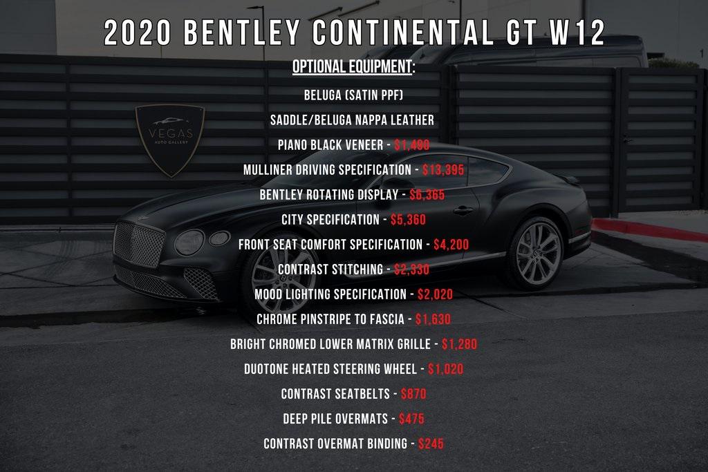 2020 BENTLEY CONTINENTAL GT W12MULLINER DRIVING SPEC, ROTATING DISPLAY, FRONT SEAT COMFORT SPEC, SATIN PPF, AND MORE!OVERVIEWThe 2020 Bentley Continental GT represents the ideal fusion of grand touring elegance, cutting-edge technology, and athletic performance. As the flagship W12 model, this Continental GT is built to cross long distances with big power and total comfort––a true grand tourer in the old-school sense. Under the hood lies a 6.0-liter twin-turbocharged W12, producing 626 horsepower and 664 lb-ft of torque. Paired with an 8-speed dual-clutch automatic transmission and an advanced all-wheel-drive system, the Continental GT accelerates from 0-60 mph in just 3.7 seconds, with a top speed of over 200 mph. On the inside, this GT has a mix of Saddle/Beluga leather upholstery and features heated/ventilated/massage seats. The center console features Bentley's 12.3-inch rotating infotainment display, with Piano Black Veneer and chrome accents throughout the rest of the cabin. The exterior design, shaped by Bentley's signature muscular proportions, showcases clean lines, a chromed matrix grille, and LED matrix headlights with crystal-cut detailing. The coupe's athletic stance is complemented by 22-inch polished wheels, massive steel brakes, and a satin PPF. The Bentley Continental GT W12 is a true flagship for those who demand the very best––blending British opulence, motorsport credibility, and grand touring comfort with a timeless design. OPTIONAL EQUIPMENTBeluga (Satin PPF)Saddle/Beluga Nappa Leather Piano Black Veneer $1,490Mulliner Driving Specification $13,39522"" 5-Open Spoke WheelsDiamond Quilted InteriorEmbroidered Bentley EmblemsJewel Fuel and Oil Filler CapsSports PedalsBentley Rotating Display $6,365City Specification $5,360Auto Dimming MirrorsHands-Free TrunkSurround View CameraPedestrian WarningFront Seat Comfort Specification $4,200Adjustable Side BolstersAdjustable Seat Cushion LengthPower Adjustable HeadrestVentilation & MassageContrast Stitching $2,330Mood Lighting Specification $2,020Chrome Pinstripe To Fascia $1,630Bright Chromed Lower Matrix Grille $1,280Duotone Heated Steering Wheel $1,020Contrast Seatbelts $870Deep Pile Overmats $475Contrast Overmat Binding $245GENERALYear: 2020Mileage: 32,685VIN #: SCBCB2ZG3LC080919Engine Size: 6.0L W12 (Twin-Turbo) Class: CoupeHorsepower: 626Color: Beluga (Satin PPF)Interior: Saddle/Beluga Leather Fuel: Premium Unleaded GasolineGear Box: 8-Speed Dual-Clutch AutomaticDoors: 2Seats: 4Cylinders: 12SAFETY EQUIPMENTAll-Wheel DriveDual Stage Driver and Passenger AirbagsElectronic Traction ControlDynamic Stability ControlRoll Stability ControlAnti-Lock Braking SystemDriver Condition ResponseDriver Monitoring AlertTire Specific Low Tire Pressure WarningADDITIONAL INFORMATION1 Key IncludedBalance of Factory Warranty (if applicable)Extended Warranties Available