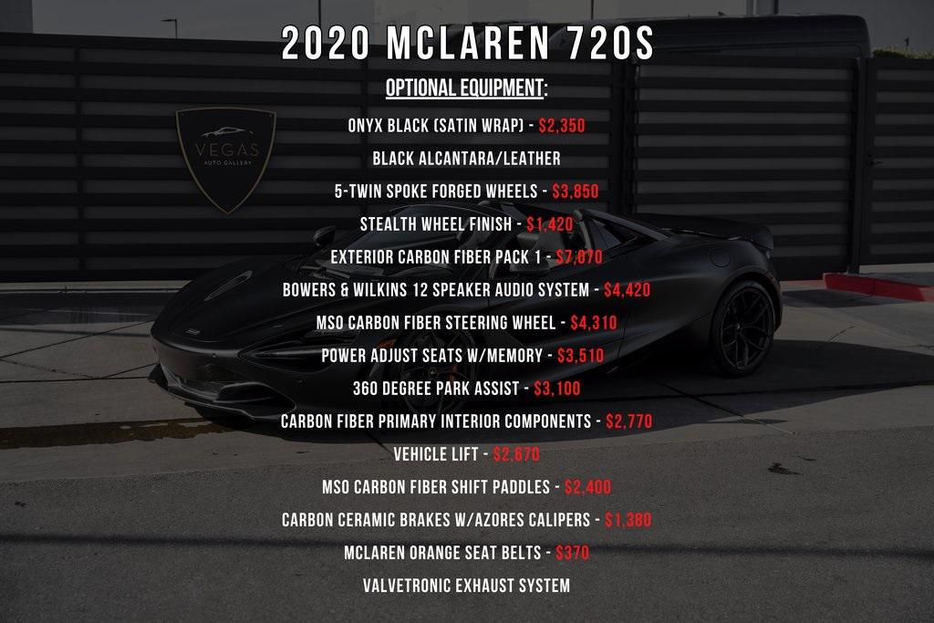 2020 MCLAREN 720S SATIN WRAP, CARBON FIBER PACKS, BOWERS & WILKINS AUDIO, VALVETRONIC EXHAUST, AND MORE!OVERVIEWIf there's one car that can blur the line between track and street, it's this one. Finished in Onyx Black with a satin wrap, this McLaren 720S boasts a whopping 710hp and 568 lb-ft of torque from its 4.0L Twin-Turbo V8. This impressive motor allows the 720S to punch above its class in terms of performance: 0-60mph in 2.8 seconds, 0-124mph in 7.8 seconds, and a top speed of 212mph. The car is built around McLaren's ultra-lightweight Monocage II carbon-fiber chassis, providing exceptional rigidity while keeping curb weight low. Proactive Chassis Control II adaptive suspension eliminates the need for traditional anti-roll bars, delivering both razor-sharp handling and a compliant ride. Advanced aerodynamics––including active rear wing and sculpted airflow channels––generate significant downforce while maintaining visual elegance. Inside, the minimalist cockpit features Black Alcantara/leather sport seats, a 12-speaker Bowers & Wilkins system, and a folding driver display to show only the most essential information. The 720S' performance-oriented vibe is continued to the exterior, with Carbon Fiber air intakes, a Valvetronic exhaust, and big carbon ceramic brakes. With just the right balance of aggression and refinement, the McLaren 720S stands out as one of the most capable supercars of its generation with carbon fiber, sharp dynamics, and focused driver engagement.OPTIONAL EQUIPMENTOnyx Black (Satin Wrap) $2,350Black Alcantara/Leather5-Twin Spoke Forged Wheels $3,850Stealth Wheel Finish $1,420Exterior Carbon Fiber Pack 1 $7,070Door Mirror CasingsHood Air IntakesRear Fender Air IntakesGloss Finish VisualBowers & Wilkins 12 Speaker Audio System $4,420MSO Carbon Fiber Steering Wheel $4,310Power Adjust Seats w/Memory $3,510360 Degree Park Assist $3,100Carbon Fiber Primary Interior Components $2,770Vehicle Lift $2,670MSO Carbon Fiber Shift Paddles $2,400Carbon Ceramic Brakes w/Azores Calipers $1,380McLaren Orange Seat Belts $370Valvetronic Exhaust SystemGENERALYear: 2020Mileage: 6,680VIN #: SBM14FCA1LW005040Engine Size: 4.0L V8 (Twin-Turbo)Class: ConvertibleHorsepower: 710Color: Onyx Black (Satin Wrap)Interior: Black Alcantara/LeatherFuel: Unleaded Premium GasolineGear Box: 7-Speed Automatic w/SSG (Seamless Shift Gearbox)Doors: 2Seats: 2Cylinders: 8SAFETY EQUIPMENTABSTraction ControlStability ControlESC and Launch ControlImmobilizerDriver and Passenger AirbagsEmergency Fuel Shut Off DeviceBrake Pad Wear SensorTilt SensorHill HoldADDITIONAL INFORMATION1 Key Included Balance of Factory Warranty (if applicable)Extended Warranties Available