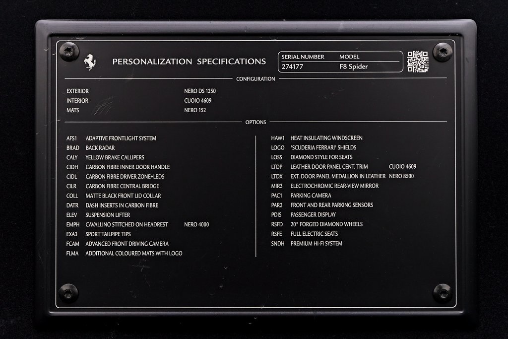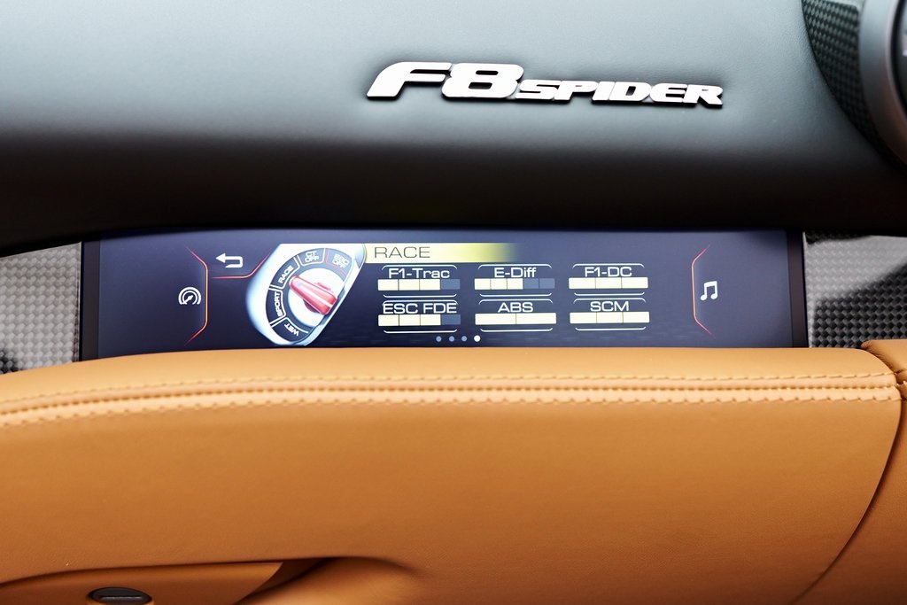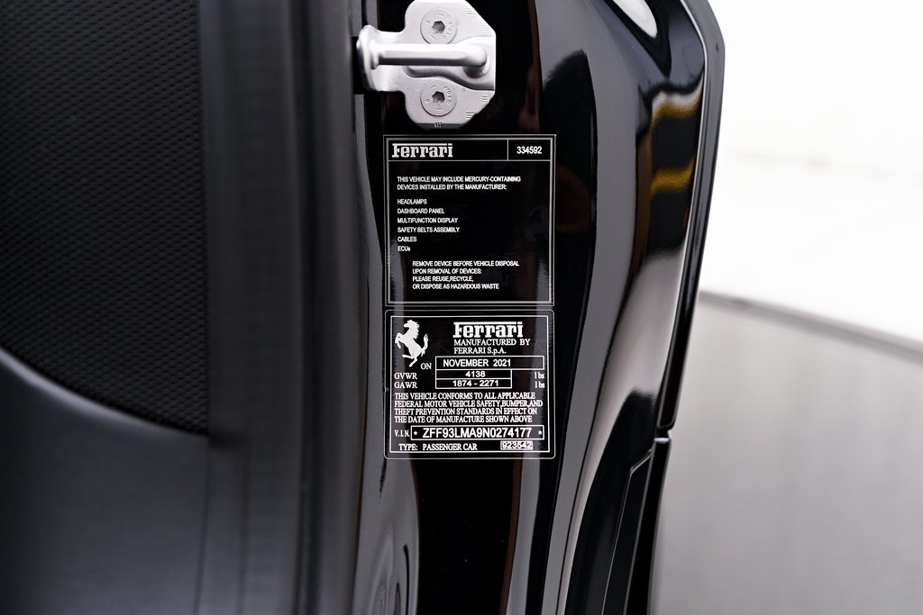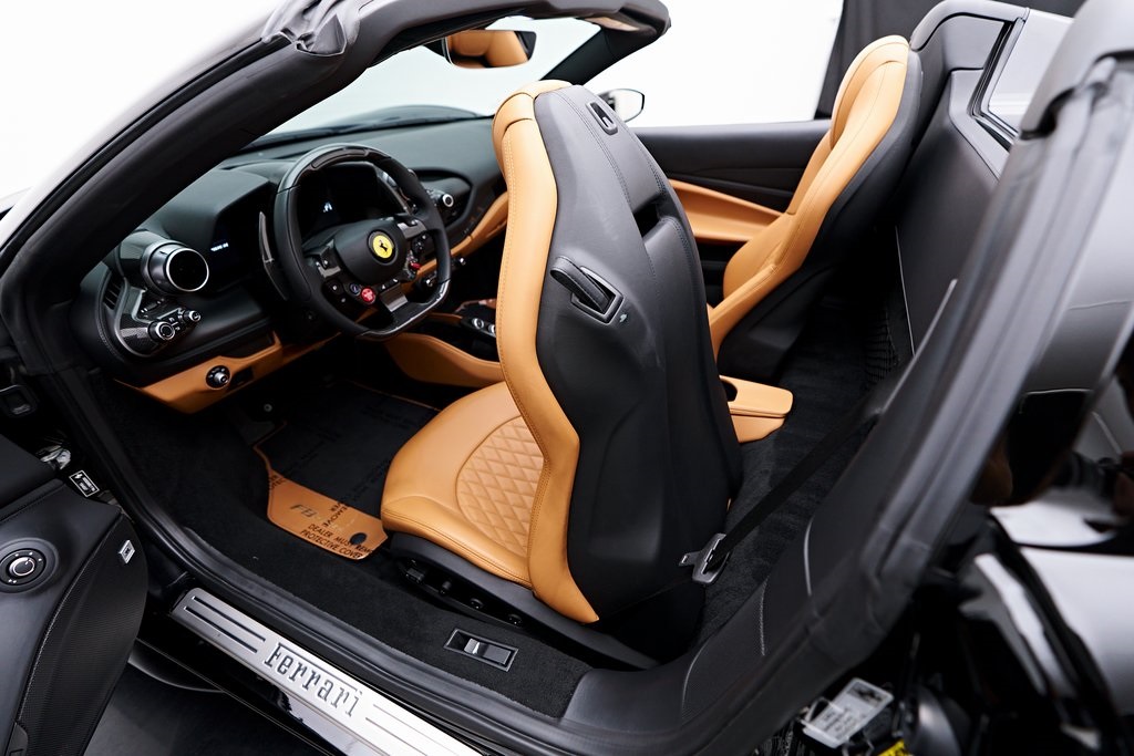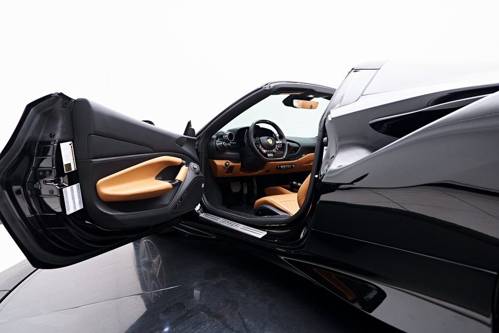 2022 FERRARI F8 SPIDERCARBON DRIVER ZONE, PASSENGER DISPLAY, DIAMOND PATTERN STYLE SEATS, AND MORE!OVERVIEWThe 2022 Ferrari F8 Spider is the embodiment of open-air performance in Maranello's lineup, blending Italian design with the raw power of a mid-engine supercar. As the convertible sibling to the F8 Tributo, the Spider delivers the same ferocious performance with the added thrill of top-down driving, letting the driver experience every note of its V8 symphony. At its heart lies Ferrari's award-winning 3.9-liter twin-turbocharged V8, producing 710 horsepower and 568 lb-ft of torque––figures that make it one of the most powerful production V8s ever built. Paired with a 7-speed dual-clutch transmission, the F8 Spider rockets from 0-60 mph in 2.9 seconds, and on to a top speed of 211 mph. Thanks to advanced aerodynamics, including the S-Duct front intake and integrated rear spoiler, exceptional downforce and stability are ensured at high speed. The folding hardtop operates in 14 seconds at speeds up to 28 mph, transforming the car from coupe-like silhouette to open-air exhilaration with the touch of a button. Inside, the cockpit reflects Ferrari's driver-first philosophy: sculpted sport seats, premium leather, carbon fiber accents, and a steering wheel equipped with the signature Manettino dial that places drive modes at your fingertips. Every switch, paddle, and display is positioned toward the driver for maximum engagement, while your plus one gets an optional Passenger Display to enjoy the thrill.OPTIONAL EQUIPMENTNeroCuoio Leather 20"" Forged Matt Grigio Corsa Diamond Cut WheelsDiamond Pattern Style Seats $3,712Yellow Brake Calipers $1,519Carbon Fiber Inner Door Handle $4,219Carbon Fiber Driver Zone + LEDS $7,593Carbon Fiber Central Bridge $2,869Carbon Fiber Dashboard Inserts $6,750Suspension Lifter $5,062AFS System $2,531Scuderia Ferrari Shields $1,856Horse Stitched On Headrests $1,266Heat Insulating Windscreen $1,181Sport Exhaust Pipes $759Adaptive Cruise Control Passenger DisplayPremium Hi-Fi SystemGENERALYear: 2022Mileage: 6,335VIN #: ZFF93LMA9N0274177Engine Size: 3.9L V8 (Twin-Turbo) Class: ConvertibleHorsepower: 710Color: NeroInterior: Cuoio Leather Fuel: Premium Unleaded GasolineGear Box: 7-Speed Dual-Clutch AutomaticDoors: 2Seats: 2Cylinders: 8SAFETY EQUIPMENTDual Stage Driver and Passenger AirbagsElectronic Traction ControlDynamic Stability ControlRoll Stability ControlAnti-Lock Braking SystemDriver Condition ResponseDriver Monitoring AlertTire Specific Low Tire Pressure WarningParking Camera & SensorsADDITIONAL INFORMATION1 Key IncludedBalance of Factory Warranty (if applicable)Extended Warranties Available