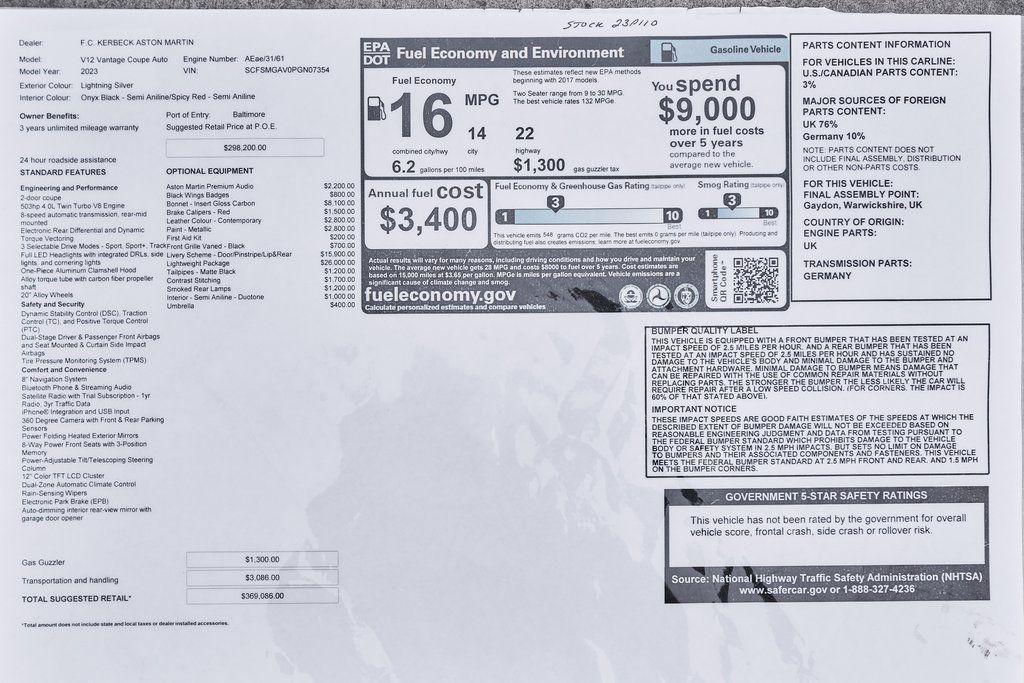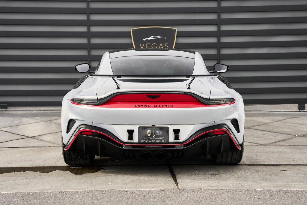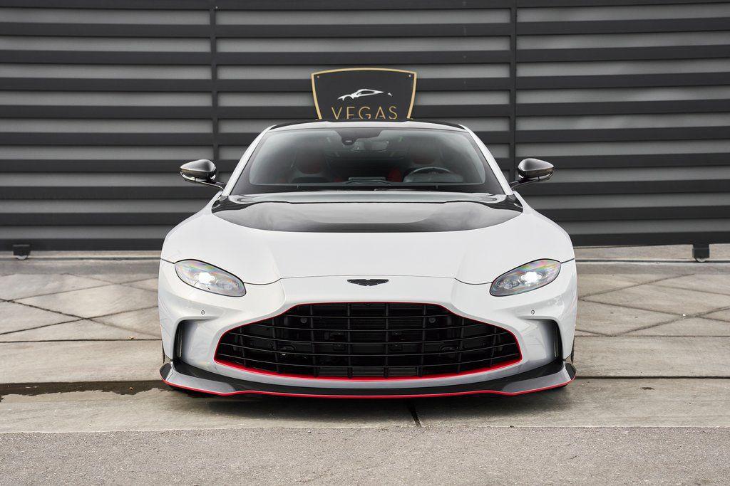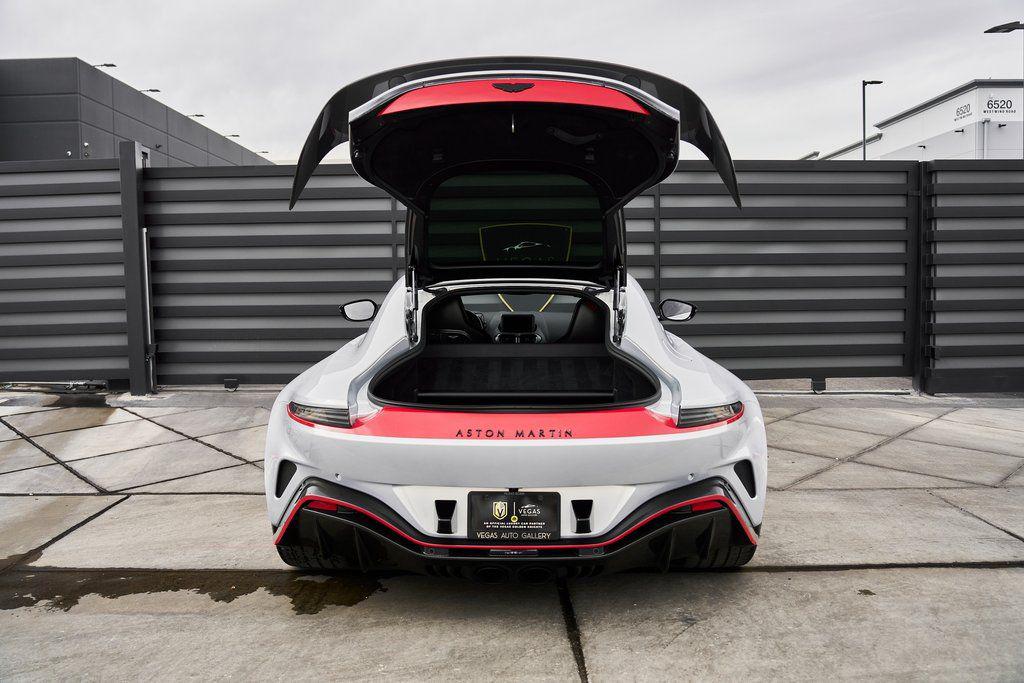 2023 ASTON MARTIN V12 VANTAGE RED LIVERY, LIGHTWEIGHT PACKAGE, GLOSS CARBON BONNET, 369K MSRP, AND MORE!OVERVIEWThe 2023 Aston Martin V12 Vantage marks the ultimate evolution of the brand's most celebrated nameplate. As the final Vantage to be fitted with Aston's biggest engine, it represents the end of an era and subsequently sold out within days of being announced back in 2022. Limited to just 333 units worldwide, the V12 Vantage is as rare as it is remarkable. Under the carbon fiber hood lies Aston Martin's legendary 5.2-liter twin-turbocharged V12, delivering a whopping 690 horsepower and 555 lb-ft of torque. Mated to an 8-speed automatic transmission and rear-wheel drive, it rockets from 0-60 mph in just 3.4 seconds, on its way to a top speed of 200 mph. The Vantage's chassis is pure Aston Martin. With adaptive damping, carbon-ceramic brakes, and a track width widened by 40mm over the standard model, it delivers superior composure and driving confidence. Extensive use of carbon fiber––in the hood, bumpers, and aero components––reduces weight and improves balance, while the aggressive aerodynamic package, including a full-width rear wing and front splitter, generates up to 450 pounds of downforce for high-speed stability. The result is a Vantage that is brutally fast yet sophisticated enough for use off the track. Visually, the V12 Vantage sits with a muscular stance. The enlarged front grille feeds the mighty V12, while sculpted lines and flared arches turn heads on every corner. This example features bespoke Q by Aston Martin finishes in red for a truly tailor-made look. The driver-centric cockpit features carbon fiber bucket seats upholstered in Semi Aniline leather, an Alcantara headliner and carbon fiber throughout. A duotone color palette and contrast stitching create a cabin that feels both intimate and bespoke. The 2023 Aston Martin V12 Vantage is a celebration of engineering legacy and power. As a send-off to the V12 era and a testament to Aston Martin's pursuit of beauty through performance, it stands as one of the most desirable and collectible grand tourers of the modern era.OPTIONAL EQUIPMENTLightning Silver Metallic $2,800Onyx Black/Spicy Red Leather $2,80021"" Satin Black Lightweight WheelsLightweight Package $26,000Livery Scheme - Door/Pinstripe/Lip & Rear $15,900Gloss Carbon Bonnet Insert $8,100Aston Martin Premium Audio $2,200Contrast Stitching $1,700Red Brake Calipers $1,500Matte Black Tailpipes $1,200Smoked Rear Taillights $1,200Duotone Interior Color Palette $1,000Black Wings Badges $800Black Vertical Grille Vanes $700Umbrella $400First Aid Kit $200GENERALYear: 2023Mileage: 10,272VIN #: SCFSMGAV0PGN07354Engine Size: 5.2L V12 (Twin-Tubocharged)Class: CoupeHorsepower: 690Color: Lightning SilverInterior: Onyx Black/Spicy Red LeatherFuel: Premium Unleaded GasolineGear Box: 8-Speed AutomaticDoors: 2Seats: 2Cylinders: 12SAFETY EQUIPMENTDual Stage Driver and Passenger AirbagsElectronic Traction ControlDynamic Stability ControlRoll Stability ControlAnti-Lock Braking SystemDriver Condition ResponseDriver Monitoring AlertTire Specific Low Tire Pressure WarningSurround View CameraADDITIONAL INFORMATION1 Key IncludedBalance of Factory Warranty (if applicable)Extended Warranties Available