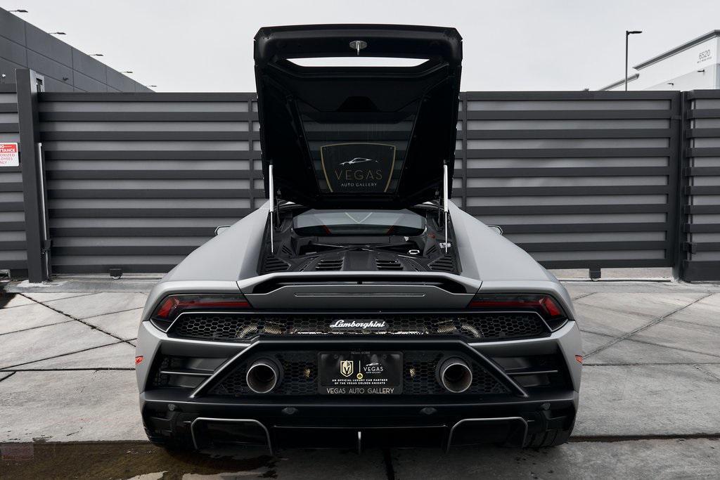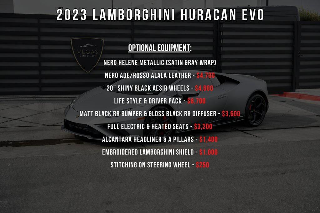 2023 LAMBORGHINI HURACAN EVO DRIVER PACK, HEATED ELECTRIC SEATS, SATIN GRAY WRAP, AND MORE!OVERVIEWThe 2023 Lamborghini Huracan EVO is a supercar that bridges raw emotion with cutting-edge technology, blending the unmistakable sound of a naturally aspirated V10 with razor-sharp handling and aggressive Italian design. It's the evolution of Lamborghinis mid-engine icon––sharper, smarter, and more exhilarating than ever before. Mounted behind the driver is a 5.2-liter naturally aspirated V10, producing 602 horsepower and 443 lb-ft of torque, sending power to the rear wheels through a lightning-fast 7-speed dual-clutch transmission. With a 0-60 mph time of just 3.3 seconds and a top speed over 202 mph, the Huracan EVO delivers relentless acceleration and an intoxicating exhaust note that builds to a howling crescendo at 8,000+ rpm. The real magic comes from Lamborghini's advanced LDVI system (Lamborghini Dinamica Veicolo Integrata)––an integrated assistant that predicts driver inputs and road conditions in real time to optimize handling, traction, and stability. With this system, the Huracan EVO is as confident in tight switchbacks as it is on wide-open straights. Visually, the EVO refines the Huracan's dramatic styling with different front and rear bumpers, as well as a larger integrated rear diffuser. Inside, the cabin is trimmed in Nero Ade/Rosso Alala leather, with contrast stitching and Alcantara accents throughout. The center console houses an 8.4-inch touchscreen with smartphone connectivity, navigation, and voice control. Driver-focused yet daily-drivable, the EVO offers selectable drive modes––Strada, Sport, and Corsa––allowing you to tailor the experience from relaxed cruising to track-focused precision. With its naturally aspirated soul, futuristic driving dynamics, and unmistakable Lamborghini character, the Huracan EVO is a true celebration of what a modern supercar should be.OPTIONAL EQUIPMENTNero Helene Metallic (Satin Gray Wrap)Nero Ade/Rosso Alala Leather $4,70020"" Shiny Black Aesir Wheels $4,600Life Style & Driver Pack $6,700Front Axle LiftCarbon Ceramic BrakesRed Brake CalipersSmartphone InterfaceCup Holder & Ash TrayMagneto SuspensionTransparent Engine BonnetAnti-Theft SystemMatt Black Rr Bumper & Gloss Black Rr Diffuser $3,600Full Electric & Heated Seats $3,200Alcantara Headliner & A Pillars $1,400Embroidered Lamborghini Shield $1,000Stitching On Steering Wheel $250GENERALYear: 2023Mileage: 6,244VIN #: ZHWUF5ZF2PLA21519Engine Size: 5.2L V10Class: CoupeHorsepower: 602Color: Nero Helene (Satin Gray Wrap)Interior: Nero Ade/Rosso Alala LeatherFuel: Premium Unleaded GasolineGear Box: 7-Speed AutomaticDoors: 2Seats: 2Cylinders: 10SAFETY EQUIPMENTOutboard Front Lap and Shoulder Safety BeltsAirbag Occupancy SensorCurtain 1st and 2nd Row AirbagsDual Stage Driver and Passenger Front AirbagsTire Specific Low Tire Pressure WarningRear Backup Camera & Parking Sensors ABS & Driveline Traction Control LDVI Electronic Stability Control Anti-Locking BrakesADDITIONAL INFORMATION1 Key IncludedBalance of Factory Warranty (if applicable)Extended Warranties Available