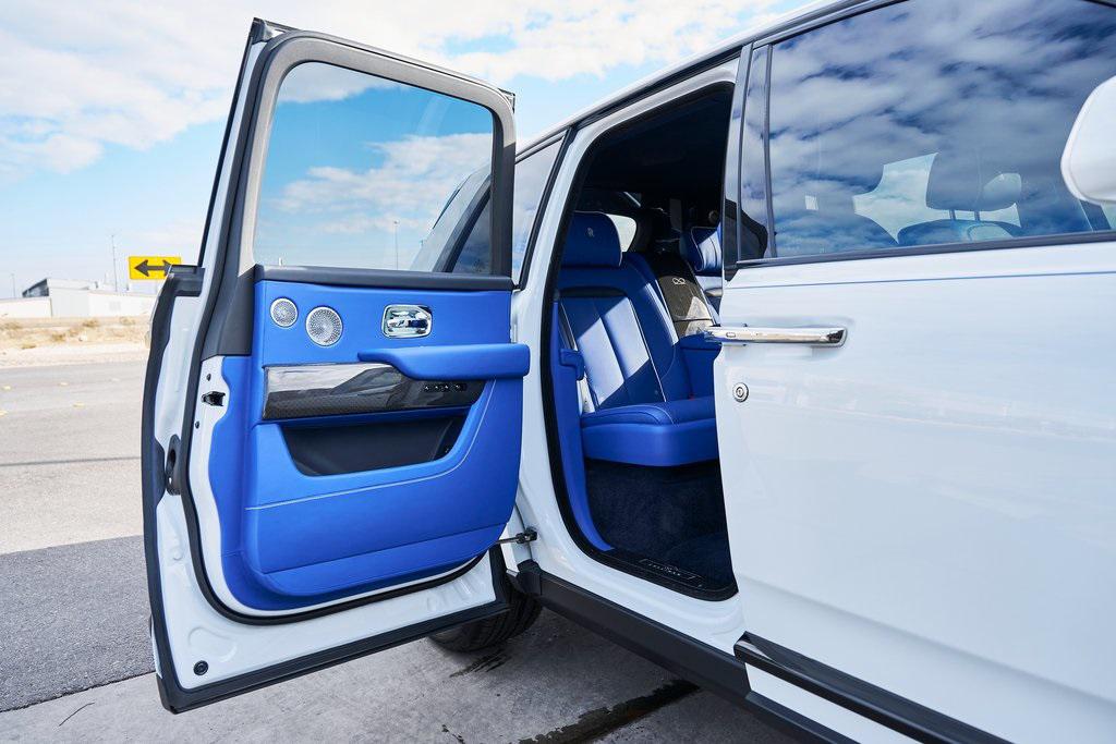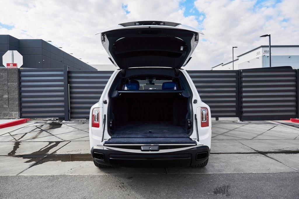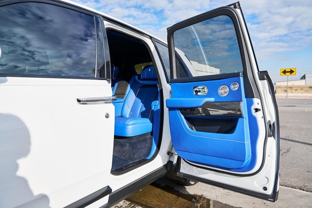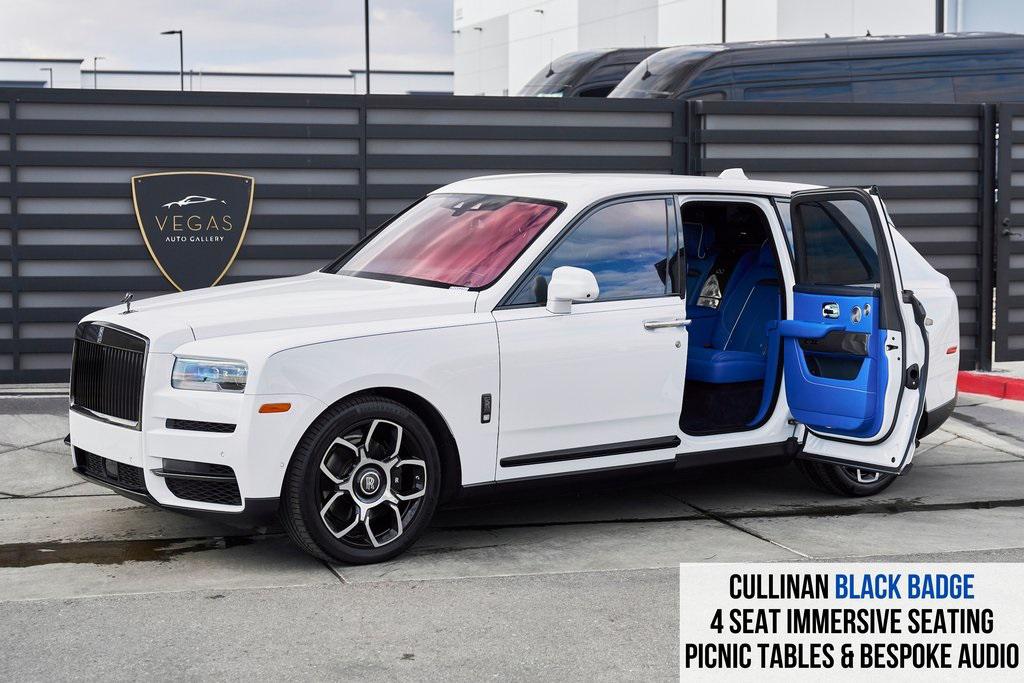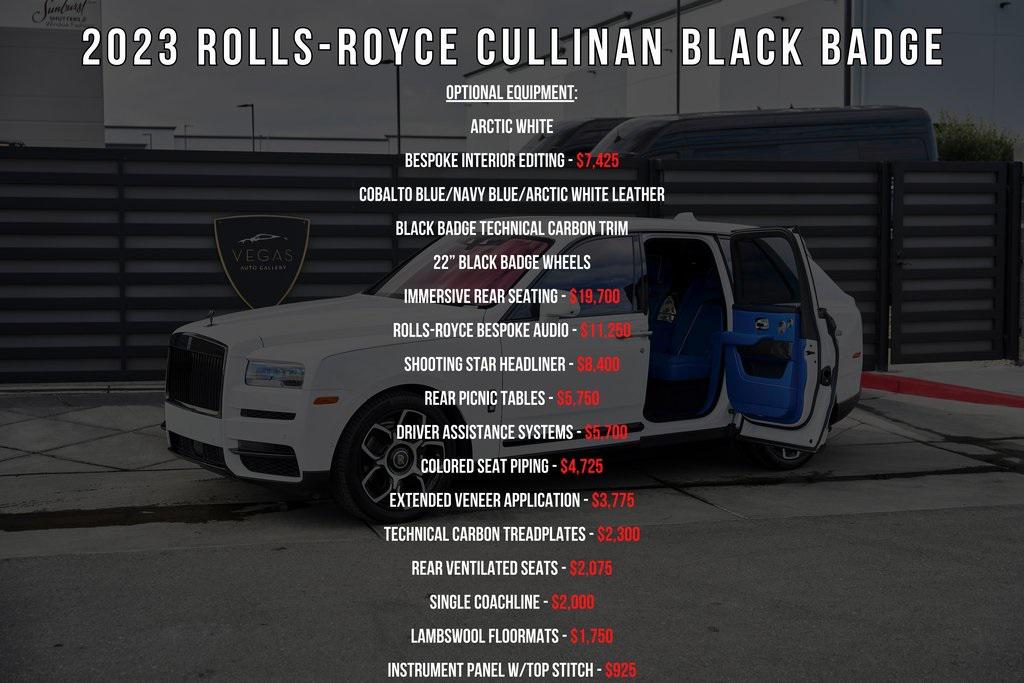 2023 ROLLS-ROYCE CULLINAN BLACK BADGEBESPOKE AUDIO SYSTEM, IMMERSIVE REAR SEATING, PICNIC TABLES, AND MORE!OVERVIEWThe 2023 Rolls-Royce Cullinan takes the concept of ultra-luxury SUV travel and elevates it to a new plane. Presented as the bolder alter-ego of the brand's flagship model, the Black Badge stands as a testament to the marque's near-limitless capacity for bespoke craftsmanship. A hand-assembled 6.75L twin-turbo V12 making 591 hp and 664 lb-ft of torque motivates the Cullinan to 60 mph in about 4.5 seconds––quite respectable when you realize this first-class suite on wheels weighs just over 6,000 lbs. Despite its size, the Cullinan glides with grace, aided by Rolls-Royce's renowned Magic Carpet Ride suspension and active air leveling. Whether cruising down the Strip or soaking up miles on a cross-country tour, this Cullinan offers peerless ride quality and confident power. As is true with most Rolls-Royce vehicles, it's what's inside that counts. Step into the Cullinan's Cobalto Blue leather interior and you'll be greeted by climate-controlled massage seats and Black Badge exclusive Technical Carbon trim. In a world filled with luxury, the Rolls-Royce Cullinan still stands alone––and this example makes it clear why: it's a rolling expression of taste and distinction, meticulously crafted for the discerning driver who demands exclusivity and artistry in every detail.OPTIONAL EQUIPMENTArctic WhiteBespoke Interior Editing $7,425Cobalto Blue/Navy Blue/Arctic White LeatherBlack Badge Technical Carbon Trim22"" Black Badge WheelsImmersive Rear Seating $19,700Fixed Middle ConsoleFixed PartitionRear Massage SeatsRear FridgeRolls-Royce Bespoke Audio $11,250Shooting Star Headliner $8,400Rear Picnic Tables $5,750Driver Assistance Systems $5,700Park AssistNight VisionAdaptive Cruise ControlColored Seat Piping $4,725Extended Veneer Application $3,775Technical Carbon Treadplates $2,300Rear Ventilated Seats $2,075Single Coachline $2,000Lambswool Floormats $1,750Instrument Panel w/Top Stitch $925Head-Up DisplayAuto High BeamsApple CarPlayHeated/Ventilated/Massage Front SeatsGENERALYear: 2023Mileage: 13,659VIN #: SLATV8C01PU215941Engine Size: 6.75L V12 (Twin-Turbo)Class: Luxury Sport UtilityHorsepower: 591Color: Arctic WhiteInterior: Cobalto Blue/Navy Blue/Arctic White LeatherFuel: Premium Unleaded GasolineGear Box: 8-Speed AutomaticDoors: 4Seats: 4Cylinders: 12SAFETY EQUIPMENTAll Wheel DriveDual Stage Driver and Passenger AirbagsElectronic Traction ControlDynamic Stability ControlRoll Stability ControlAnti-Lock Braking SystemDriver Condition ResponseChild Seat Sensor and Power Rear Child Safety LocksDriver Monitoring AlertTire Specific Low Tire Pressure WarningBlindspot AssistActive Cruise ControlADDITIONAL INFORMATION1 Key IncludedBalance of Factory Warranty (if applicable)Extended Warranties Available