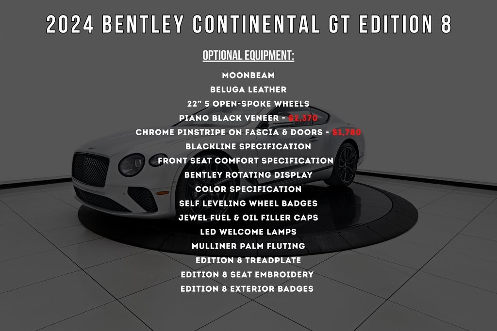 2024 BENTLEY CONTINENTAL GT V8EDITION 8, BLACKLINE SPEC, FRONT SEAT COMFORT SPEC, LOW MILES, AND MORE!OVERVIEWThe 2024 Bentley Continental GT Edition 8 is a fitting tribute to the legendary twin-turbo V8 engine, marking the final chapter of this powerplant in Bentley's grand touring range. Exclusive to North America, the Edition 8 combines the Continental's timeless design and effortless performance with rare Mulliner details that elevate it into a unique collector's piece. Under the hood lies the 4.0-liter twin-turbocharged V8, producing 542 horsepower and 568 lb-ft of torque, paired with an 8-speed dual-clutch transmission and all-wheel drive. The result is a 0-60 mph time of 3.9 seconds, with the power delivered in Bentley's signature fashion of refinement and authority. Visually, the Edition 8 stands apart with subtle touches. The Blackline Specification, jewel fuel filler cap, 22-inch Mulliner wheels with self-leveling badges, and Edition 8 fender badging distinguish it from regular traffic. Inside, Mulliner craftsmanship is on full display, with Palm Fluting on the seats––a design previously reserved for bespoke commissions––alongside embroidered Edition 8 emblems, engraved treadplates, and Bentley's iconic Rotating Display. Every surface, from the hand-stitched leathers to the polished veneers, is a reminder of Crewe's uncompromising attention to detail. As the last Continental GT to carry Bentleys V8 engine, the Edition 8 is not just a grand tourer––it's a piece of history. OPTIONAL EQUIPMENTMoonbeamBeluga Leather22"" 5 Open-Spoke WheelsPiano Black Veneer $2,370Chrome Pinstripe On Fascia & Doors $1,780Blackline SpecificationFront Seat Comfort SpecificationBentley Rotating DisplayColor SpecificationSelf Leveling Wheel BadgesJewel Fuel & Oil Filler CapsLED Welcome LampsMulliner Palm FlutingEdition 8 TreadplateEdition 8 Seat Embroidery Edition 8 Exterior BadgesGENERALYear: 2024Mileage: 925VIN #: SCBCG2ZG4RC017354Engine Size: 4.0L V8 (Twin-Turbo) Class: Coupe Horsepower: 542Color: Moonbeam Interior: Beluga Leather Fuel: Premium Unleaded GasolineGear Box: 8-Speed Dual-Clutch AutomaticDoors: 2Seats: 4Cylinders: 8SAFETY EQUIPMENTAll-Wheel DriveDual Stage Driver and Passenger AirbagsElectronic Traction ControlDynamic Stability ControlRoll Stability ControlAnti-Lock Braking SystemDriver Condition ResponseDriver Monitoring AlertTire Specific Low Tire Pressure Warning360 View Back-Up CameraADDITIONAL INFORMATION3 Keys IncludedBalance of Factory Warranty (if applicable)Extended Warranties Available