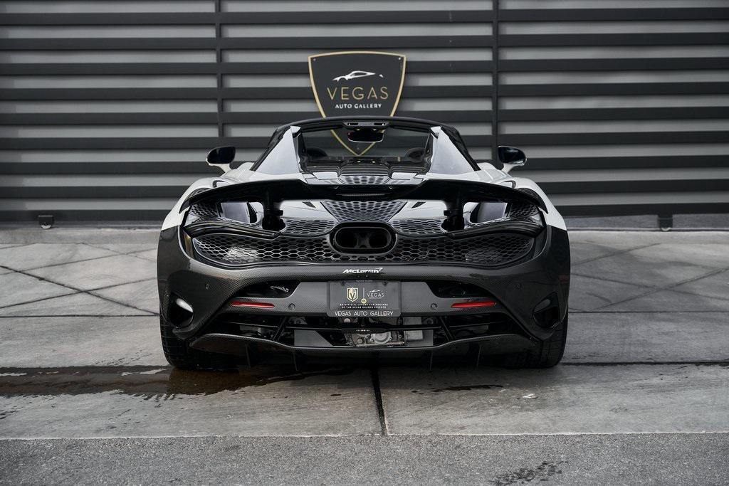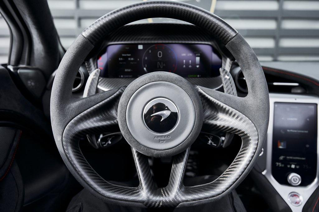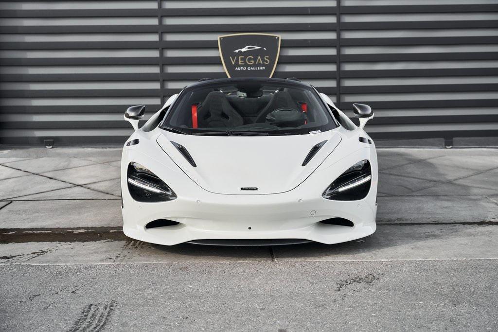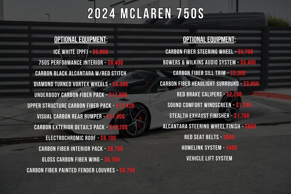 2024 MCLAREN 750SLOADED WITH CARBON FIBER, PERFORMANCE INTERIOR, CARBON FIBER STEERING WHEEL, PPF, AND MORE!OVERVIEWIf there's one car that can blur the line between track and street, it's this one. Replacing the 720S, the 750S refines everything that came before it: lighter, sharper, and more emotionally engaging. Powering this McLaren is a 4.0-liter twin-turbocharged V8 engine producing 740 horsepower and 590 lb-ft of torque. Paired with a 7-speed dual-clutch transmission, it propels the car from 0-60 mph in just 2.7 seconds and on to a top speed of 206 mph. The revised engine mapping, freer-flowing exhaust, and reduced weight––66 pounds lighter than the 720S––make the 750S not only faster, but more responsive at every throttle input. The chassis is built around McLaren's signature carbon-fiber Monocage II, providing extraordinary rigidity and ultra-light weight. Advanced Proactive Chassis Control III suspension, recalibrated for greater feedback, delivers balance and agility that border on telepathic. Aerodynamic enhancements––an extended front splitter, redesigned rear wing, and sculpted underbody––generate significant downforce without compromising elegance. The result is a car that feels composed at speed and connected through every corner. Inside, the 750S combines minimalist design with sophisticated technology. A new centrally mounted digital cluster moves with the steering column for perfect visibility, while the driver-focused cockpit and carbon fiber seats wrap around you like a tailored suit. High-grade Alcantara, carbon fiber trim, and machined aluminum define the cabin's tactile quality. The infotainment system features improved responsiveness and Apple CarPlay integration. Lighter, quicker, and more communicative than ever, the McLaren 750S is built for enthusiasts who demand a supercar that delivers unfiltered connection, breathtaking performance, and bespoke British craftsmanship.OPTIONAL EQUIPMENTIce White (PPF) $5,900750S Performance Interior $9,400Carbon Black Alcantara w/Red StitchDiamond Turned Vortex Wheels $8,300Underbody Carbon Fiber Pack $17,800Front SplitterRear DiffuserUpper Structure Carbon Fiber Pack $17,420B-Pillar Outer TrimTonneau CoverVisual Carbon Rear Bumper $11,400Carbon Exterior Details Pack $10,200Hood Air IntakesRear Fender IntakesDoor Mirror HousingsElectrochromic Roof $9,100Carbon Fiber Interior Pack $8,750Gloss Carbon Fiber Wing $8,750Carbon Fiber Painted Fender Louvres $8,750Carbon Fiber Steering Wheel $5,700Bowers & Wilkins Audio System $5,400Carbon Fiber Sill Trim $3,300Carbon Fiber Headlight Surround $3,050Red Brake Calipers $2,200Sound Comfort Windscreen $1,750Stealth Exhaust Finisher $1,750Alcantara Steering Wheel Finish $650Red Seat Belts $640Homelink System $400Vehicle Lift SystemGENERALYear: 2024Mileage: 2,042VIN #: SBM14BCA7RW007263Engine Size: 4.0L V8 (Twin-Turbo)Class: SpiderHorsepower: 740Color: Ice White (PPF)Interior: Carbon BlackFuel: Unleaded Premium GasolineGear Box: 7-Speed Dual-Clutch Automatic Doors: 2Seats: 2Cylinders: 8SAFETY EQUIPMENTABSTraction ControlStability ControlESC and Launch ControlImmobilizerDriver and Passenger AirbagsEmergency Fuel Shut Off DeviceBrake Pad Wear SensorTilt SensorHill HoldADDITIONAL INFORMATION1 Key Included Balance of Factory Warranty (if applicable)Extended Warranties Available