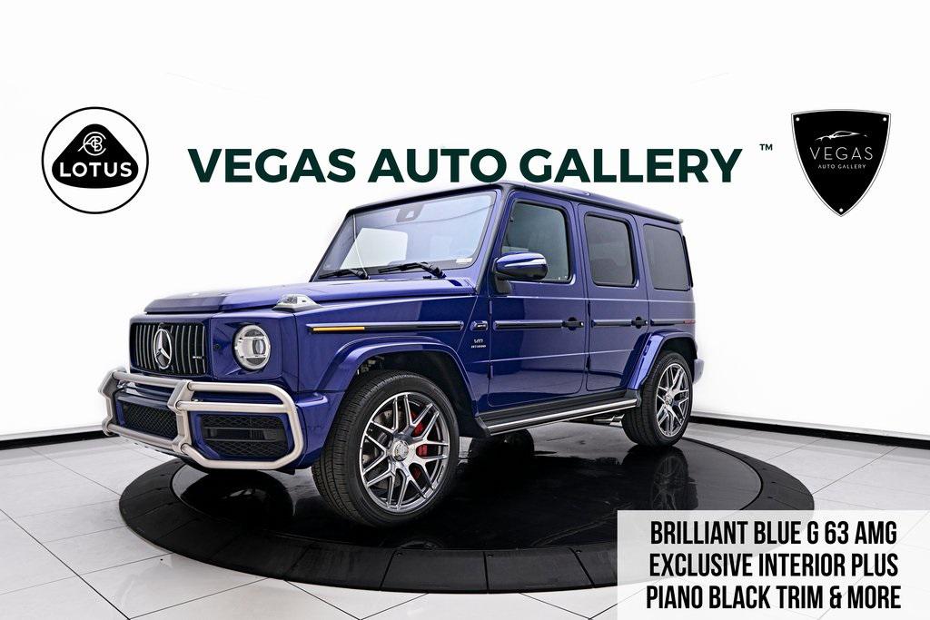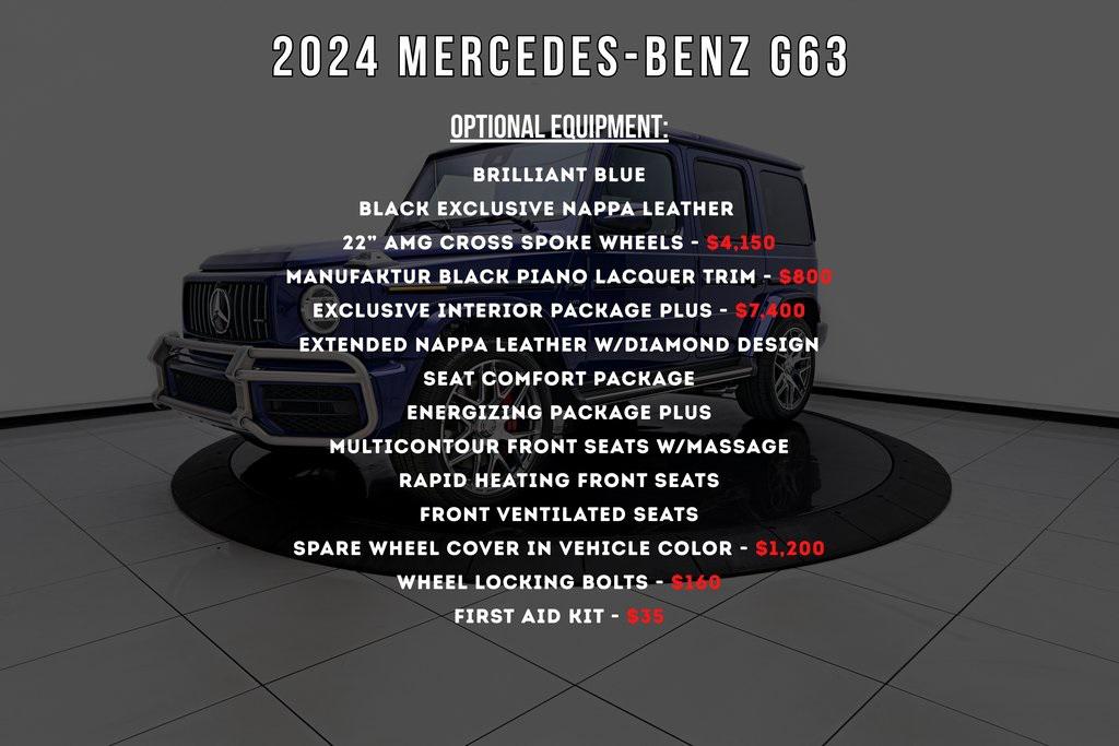 2024 MERCEDES-BENZ G63 BURMESTER SOUND SYSTEM, EXCLUSIVE INTERIOR PACKAGE, CROSS SPOKE FORGED WHEELS, AND MORE!OVERVIEWThe Mercedes-Benz G63 AMG needs no introduction as its striking presence and unmistakable silhouette speak for themselves. Originally developed as a military vehicle but refined through decades of opulence in Beverly Hills the G-Wagon still looks like it could climb a mountain––because it can––but now it does so with 577 hp and 627 lb-ft of torque eagerly waiting to be unleashed under its squared-off hood. Its handcrafted 4.0L Bi-turbo V8 turns it into a 5800-pound brick on wheels that defies physics rocketing from 0 to 60 mph in just 4.2 seconds. An AMG-tuned suspension, selectable drive modes, and three locking differentials give the driver full control over every terrain, from city streets to off-road trails. The cabin of this G63 features Black Nappa leather which is upgraded through the Exclusive Interior Package. Such upgrades include premium extended Nappa leather upholstery, multi-contour massaging/climate controlled seats, and diamond-stitching throughout to create a comfort-focused environment. For the enthusiast who wants something with a presence, pedigree and pure personality the Mercedes-Benz G63 AMG isn't just an SUV––it's a lifestyle.OPTIONAL EQUIPMENTBrilliant BlueBlack Exclusive Nappa Leather22"" AMG Cross Spoke Wheels $4,150Manufaktur Black Piano Lacquer Trim $800Exclusive Interior Package Plus $7,400Extended Nappa Leather w/Diamond DesignSeat Comfort PackageENERGIZING Package PlusMulticontour Front Seats w/MassageRapid Heating Front SeatsFront Ventilated SeatsSpare Wheel Cover In Vehicle Color $1,200Wheel Locking Bolts $160First Aid Kit $35GENERALYear: 2024Mileage: 4,212VIN #: W1NYC7HJ1RX512461Engine Size: 4.0L V8 (Bi-turbo) Class: SUVHorsepower: 577Color: Brilliant Blue Interior: Black Exclusive Nappa LeatherFuel: Premium Unleaded GasolineGear Box: 9-Speed AutomaticDoors: 4Seats: 5Cylinders: 8SAFETY EQUIPMENTOutboard Front Lap and Shoulder Safety BeltsAirbag Occupancy SensorCurtain 1st and 2nd Row AirbagsDual Stage Driver and Passenger Front AirbagsTire Specific Low Tire Pressure WarningTraction ControlAnti-Locking BrakesPerimeter AlarmParktronic w/Active Parking AssistFront & Rear Parking SensorsBlind Spot Assist Active Brake AssistAerial View Camera SystemLane Keeping AssistADDITIONAL INFORMATION1 Key IncludedBalance of Factory Warranty (if applicable)Extended Warranties Available
