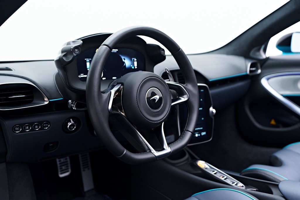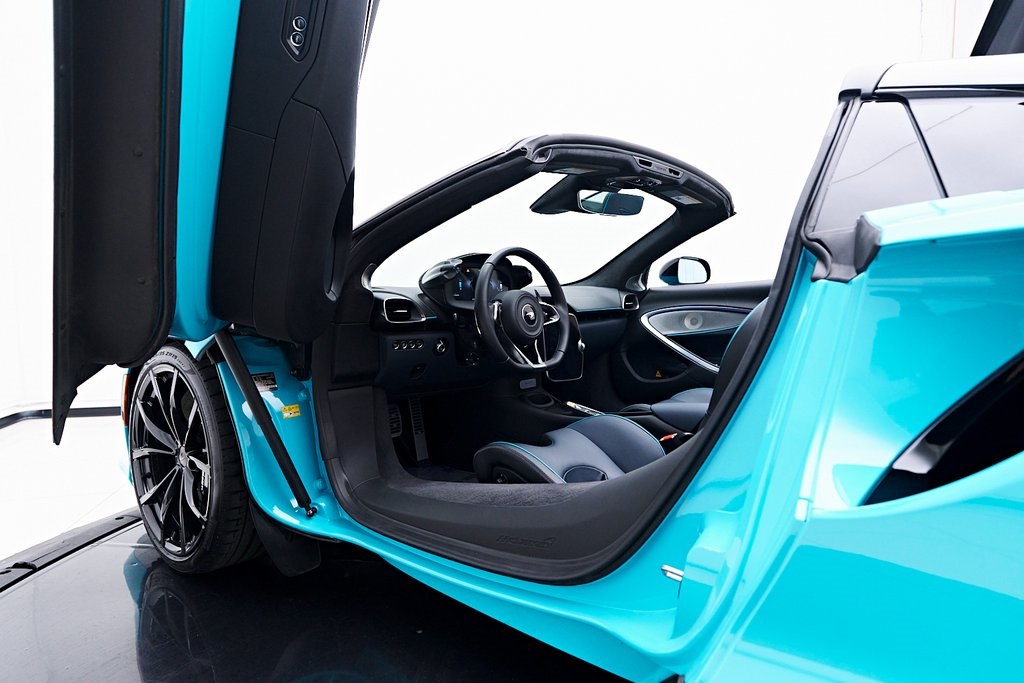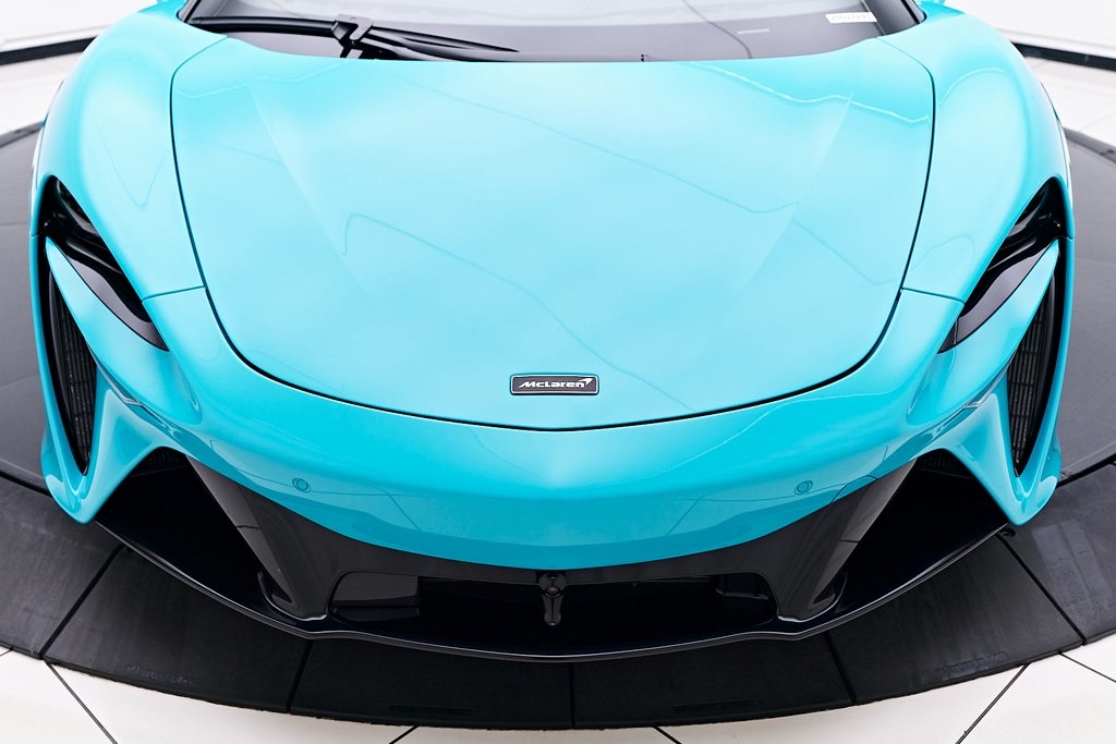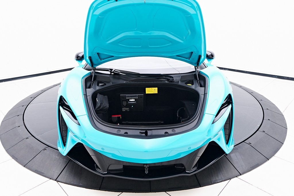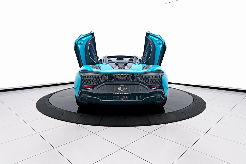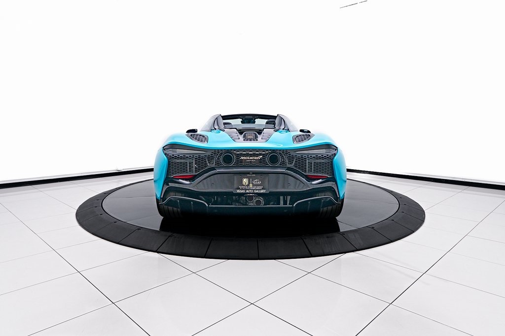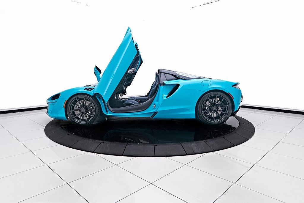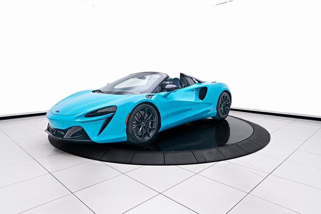 2025 MCLAREN ARTURA TECHLUX SPIDERMSO TOKYO CYAN EXTERIOR, CARBON BLACK ALCANTARA INTERIOR, ELECTROCHROMIC ROOF, BOWERS & WILKINS AUDIO SYSTEM, TECHNOLOGY PACKAGE, DRIVER ASSISTANCE PACKAGE, SPORT EXHAUST, VEHICLE LIFT & MORE! OVERVIEW The 2025 McLaren Artura TechLux Spider is a stunning evolution of McLaren's iconic supercar lineage, blending cutting-edge hybrid technology with open-air exhilaration. Powered by a 3.0-liter twin-turbo V6 engine paired with an axial flux electric motor, it produces a combined 671 horsepower and 531 lb-ft of torque, providing lightning-fast acceleration and an unforgettable driving experience. The TechLux Spider features a lightweight carbon-fiber monocoque chassis, ensuring optimal performance and agility while maintaining the rigidity and safety McLaren is known for. Inside, the cabin is luxuriously appointed with soft-grain leather, advanced technology, and intuitive controls, creating a perfect balance of sophistication and sportiness. With its retractable roof, the Artura Spider delivers the ultimate open-top driving experience while maintaining impressive aerodynamic efficiency. The 2025 McLaren Artura TechLux Spider offers unparalleled performance, exceptional luxury, and a bold design, making it the perfect choice for discerning drivers seeking the best of both worlds.OPTIONAL EQUIPMENTCalipers - Black + Silver Machined Logo$2,200Wheel Finish - Gloss Black$1,70010-Spoke SLW Dynamo Forged Alloy Wheels$4,950Vehicle LiftVehicle Tracking System$1,000Technology Package$3,110Volumetric Alarm$500Driving Assistance Package$8,350Warning Triangle $200Fire Extinguisher $300Floor Mat Set - Teal AccentPracticality PackageTechLux Spec$9,400Armrest w/McLaren Branding $600Carbon Fiber Interior Package$4,050Seats - ClubSport w/Lumbar Adjustment$1,250TechLux -Ink/Black & Teal AccentStealth Badge PackageBlack Package$3,200Exhaust Finisher - StealthSport Exhaust$5,100Roof - Electrochromic $9,400MSO Exterior Paint - Tokyo Cyan$9,500Bowers & Wilkins Audio System GENERAL Year: 2025Mileage: 4,712VIN #: SBM16BEA6SW002729Engine Size: 3.0L V6 (Twin-Turbo) and Electric Motor Class: Hybrid Sports Car Horsepower: 671Color: MSO - Tokyo CyanInterior: Carbon Black AlcanrataFuel: Unleaded Premium Gasoline Gear Box: 8-Speed Automatic Doors: 2Seats: 2Cylinders: 6SAFETY EQUIPMENT Outboard Front Lap And Shoulder Safety Belts -Incl: Pretensioners Restricted Driving Mode Driver And Passenger Knee Airbag Airbag Occupancy Sensor Dual Stage Driver And Passenger Door-Mounted Side Airbags Dual Stage Driver And Passenger Front Airbags Tire Specific Low Tire Pressure Warning Side Impact BeamsADDITIONAL INFORMATION 1 Key Included Balance of Factory Warranty (if applicable) Extended Warranties Available