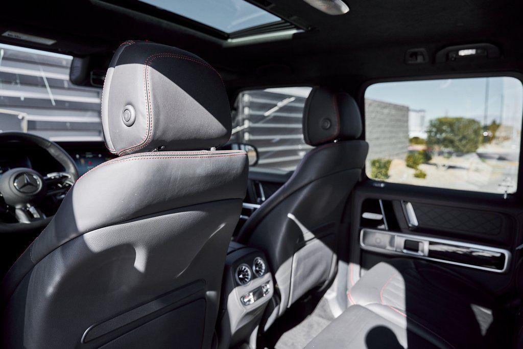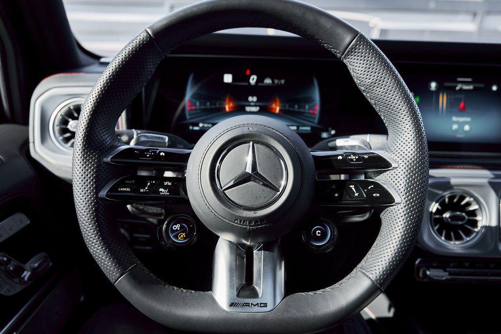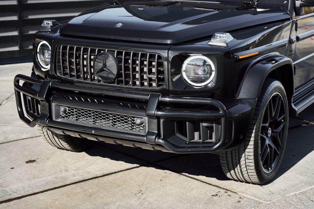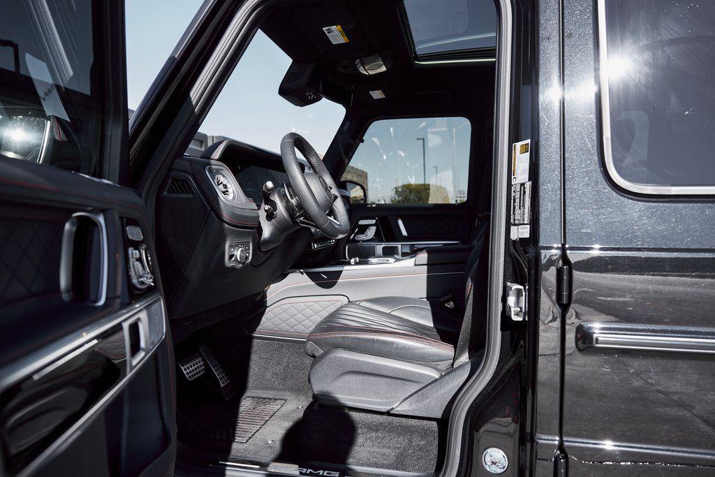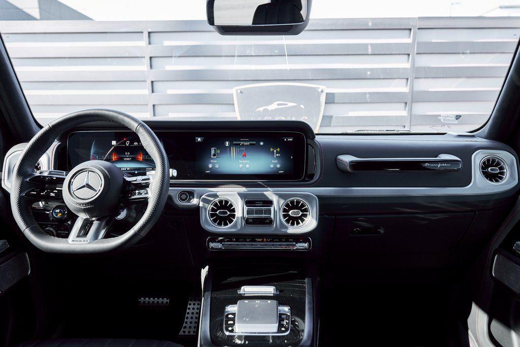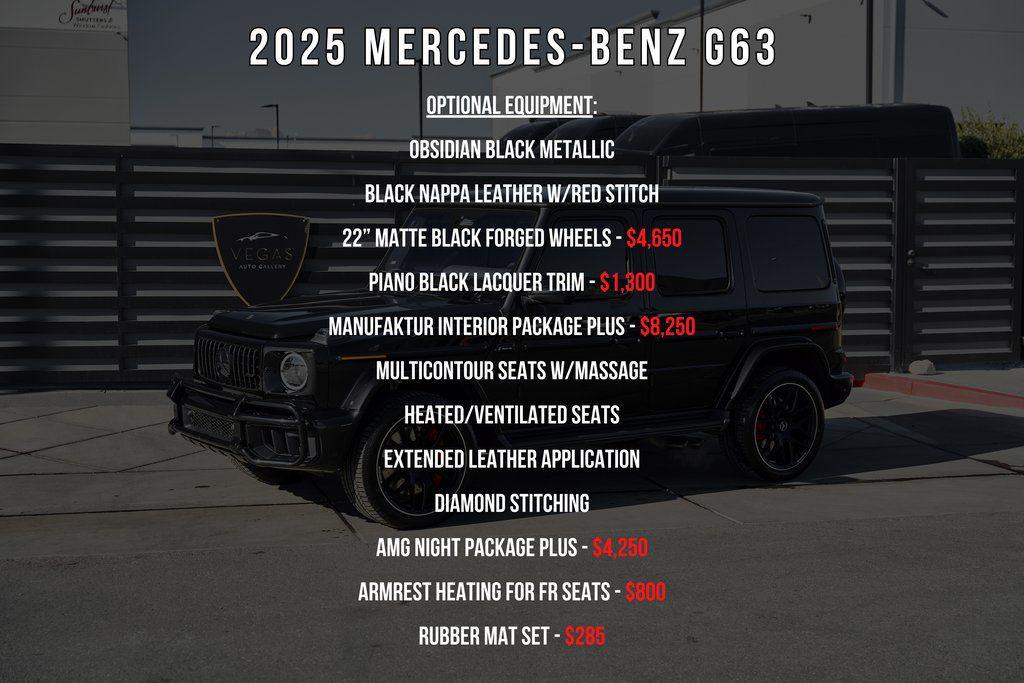 2025 MERCEDES-BENZ G63 MANUFAKTUR INTERIOR PACKAGE, AMG NIGHT PACKAGE PLUS, PIANO BLACK LACQUER, AND MORE!OVERVIEWThe Mercedes-Benz G63 AMG needs no introduction as its striking presence and unmistakable silhouette speak for themselves. Originally developed as a military vehicle but refined through decades of opulence in Beverly Hills the G-Wagon still looks like it could climb a mountain––because it can––but now it does so with 577 hp and 627 lb-ft of torque eagerly waiting to be unleashed under its squared-off hood. Its handcrafted 4.0L Bi-turbo V8 turns it into a 5800-pound brick on wheels that defies physics rocketing from 0 to 60 mph in just 4.2 seconds. An AMG-tuned suspension, selectable drive modes, and three locking differentials give the driver full control over every terrain, from city streets to off-road trails. Inside, the cabin is wrapped in Black Nappa leather accented by red stitching and further enhanced thanks to the Manufaktur Interior Package Plus. This package means you'll find extended application of Nappa leather, heated/ventilated/massage seats, and diamond stitching throughout. Additional features include a Burmester sound system and ambient lighting for a comfort-focused environment. For the enthusiast who wants something with a presence, pedigree and pure personality the Mercedes-Benz G63 AMG isn't just an SUV––it's a lifestyle.OPTIONAL EQUIPMENTObsidian Black MetallicBlack Nappa Leather w/Red Stitch22"" Matte Black Forged Wheels $4,650Piano Black Lacquer Trim $1,300Manufaktur Interior Package Plus $8,250Multicontour Seats w/MassageHeated/Ventilated SeatsExtended Leather ApplicationDiamond StitchingAMG Night Package Plus $4,250Armrest Heating For Fr Seats $800Rubber Mat Set $285GENERALYear: 2025Mileage: 12,958VIN #: W1NWH5AB7SX035900Engine Size: 4.0L V8 (Bi-turbo) Class:SUVHorsepower: 577Color: Obsidian Black MetallicInterior: Black Nappa Leather Fuel: Premium Unleaded GasolineGear Box: 9-Speed AutomaticDoors: 4Seats: 5Cylinders: 8SAFETY EQUIPMENTOutboard Front Lap and Shoulder Safety BeltsAirbag Occupancy SensorCurtain 1st and 2nd Row AirbagsDual Stage Driver and Passenger Front AirbagsTire Specific Low Tire Pressure WarningTraction ControlAnti-Locking BrakesPerimeter AlarmParktronic w/Active Parking AssistFront & Rear Parking SensorsBlind Spot Assist Active Brake AssistAerial View Camera SystemADDITIONAL INFORMATION1 Key IncludedBalance of Factory Warranty (if applicable)Extended Warranties Available