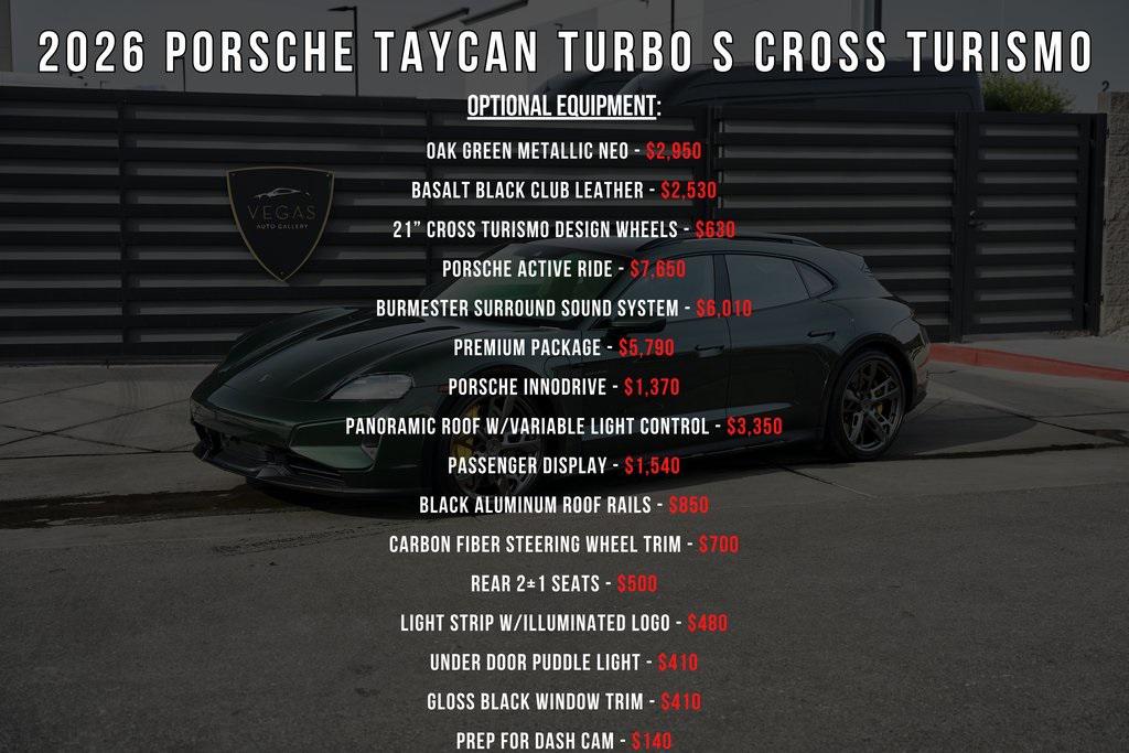 2026 PORSCHE TAYCAN TURBO S CROSS TURISMOCLIMATE CONTROLLED SEATS, PORSCHE ACTIVE RIDE, PREMIUM PACKAGE, BURMESTER AUDIO, AND MORE!OVERVIEWThe 2026 Taycan Turbo S Cross Turismo is what happens when Porsche takes supercar-level electric performance and blends it with the versatility of a family hauler. It's fast in a way that feels unreal, practical in a way most performance cars never are, and still unmistakably a Porsche in how it drives. Power comes from a dual-motor all-wheel-drive setup producing up to 938 horsepower with overboost and Launch Control, delivering instant torque and acceleration. The two-speed transmission on the rear axle gives it both explosive launches and strong high-speed pull, with 0-60 mph coming through in around 2.5 seconds. What sets the Cross Turismo apart is that it adds real usability without losing the Taycan's edge. The raised ride height and extra cargo space make it more adaptable for everyday life or rougher roads. Visually, it's arguably one of the best-looking EVs on the market. The wide stance, sculpted bodywork, and signature LED lighting give it a sleek, aggressive presence, while the wagon profile adds a unique character you don't see in most high-performance cars today. It looks purposeful, modern, and just different enough to stand out. Step inside and you're greeted with a cockpit that blends Porsche tradition with next-gen tech. From the wraparound digital displays to the 14-way Comfort Seats, everything is focused, intentional, and driver-first. Heated and ventilated seats, advanced driver assistance, and Burmester audio make it just as comfortable on long drives as it is thrilling on back roads. Some notable added options include Porsche Active Ride, a Panoramic Roof with Variable Light Control, and ceramic composite brakes. Designed to thrill, this stunning Porsche Taycan Turbo S Cross Turismo delivers loads of creature comforts, cutting-edge technology, and the ultimate expression of Porsche engineering in an all-electric form.OPTIONAL EQUIPMENTOak Green Metallic Neo $2,950Basalt Black Club Leather $2,53021"" Cross Turismo Design Wheels $630Porsche Active Ride $7,650Burmester Surround Sound System $6,010Premium Package $5,790Soft Close DoorsFront Seat VentilationSurround View CameraHead-Up DisplayThermal & Noise Insulated GlassAir Quality SystemPorsche Innodrive $1,370Panoramic Roof w/Variable Light Control $3,350Passenger Display $1,540Black Aluminum Roof Rails $850Carbon Fiber Steering Wheel Trim $700Rear 2+1 Seats $500Light Strip w/Illuminated Logo $480Under Door Puddle Light $410Gloss Black Window Trim $410Prep For Dash Cam $140GENERALYear: 2026Mileage: 997VIN #: WP0BC2Y16TSA58005Engine Size: EV Class: WagonHorsepower: 938Color: Oak Green Metallic NeoInterior: Basalt Black Leather Fuel: EVGear Box: 2-speed rear gearboxDoors: 4Seats: 5SAFETY EQUIPMENTPorsche Stability ManagementForward Collision Warning with Automatic Emergency BrakingLane Keep Assist & Lane Departure WarningOutboard Front Lap and Shoulder Safety BeltsAirbag Occupancy SensorCurtain 1st and 2nd Row AirbagsDual Stage Driver and Passenger Front AirbagsTire Specific Low Tire Pressure WarningTraction ControlAnti-Locking BrakesPerimeter AlarmADDITIONAL INFORMATION1 Key IncludedBalance of Factory Warranty (if applicable)Extended Warranties Available